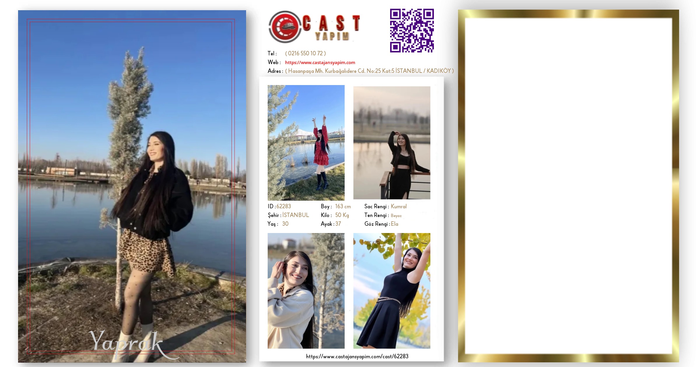Merhaba! Ben Yaprak, İstanbul'da yaşayan 30 yaşında bir oyuncu adayıyım. Kumral saçlarım, ela gözlerim, 163 boyum ve beyaz tenimle dikkat çekiyorum.