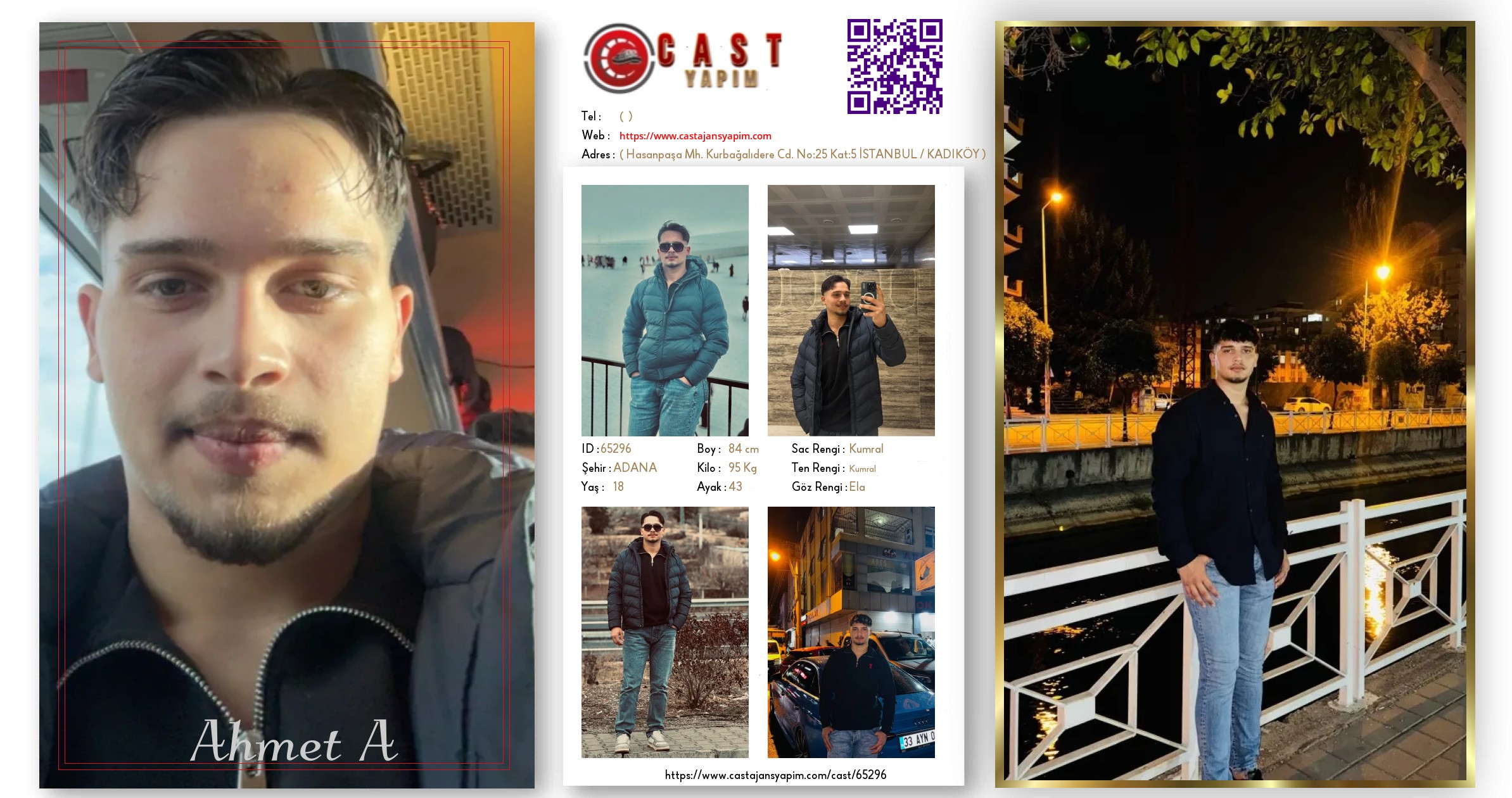 Merhaba, ben Ahmet Akcan, Adana'da yaşayan 18 yaşında bir oyuncu adayıyım. Kumral saçlarım, ela gözlerim ve 84 boyumla dikkat çekiyorum. Kumral tenimle kameralar karşısında kendimi göstermeye hazırım.