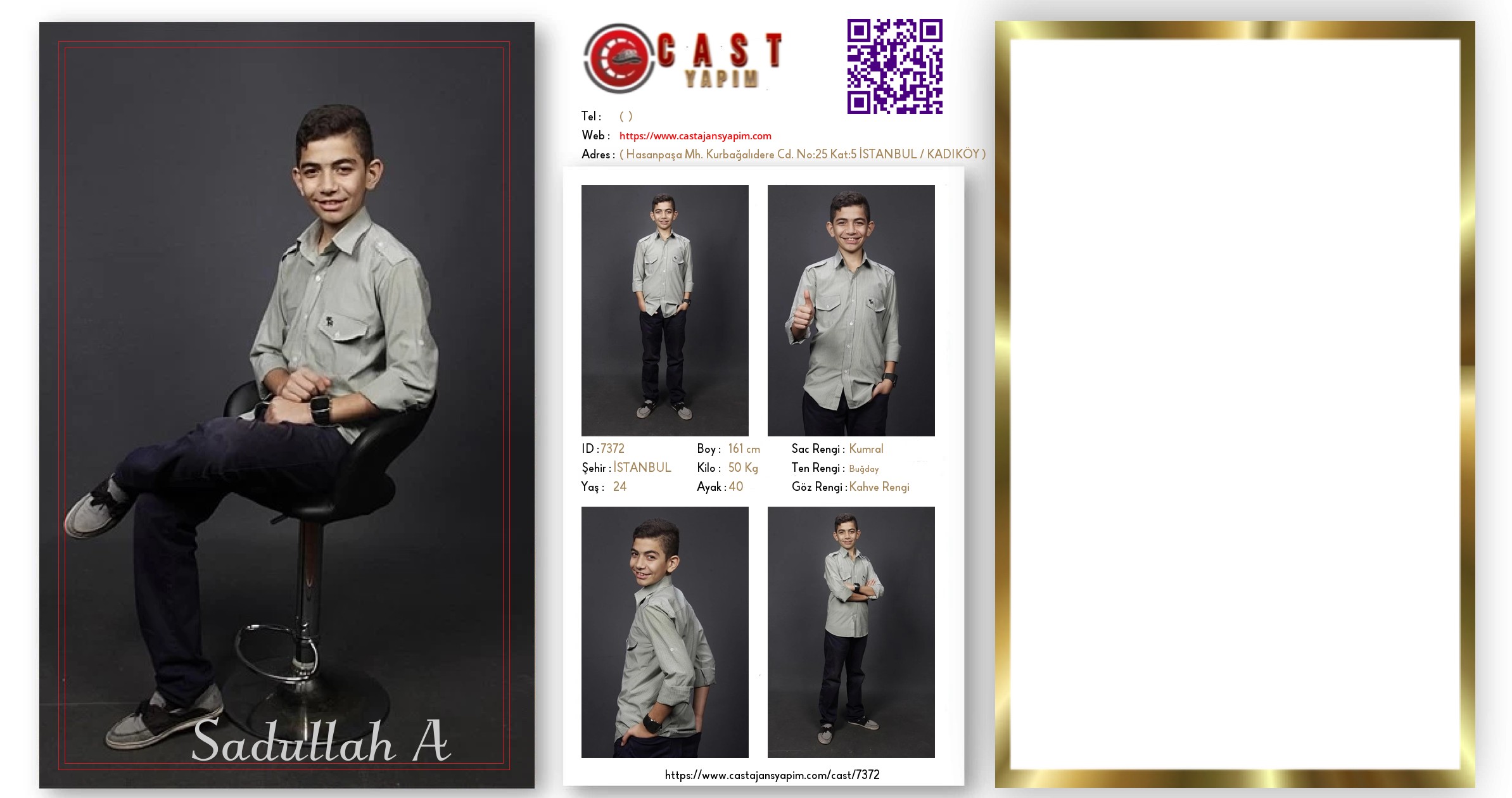 Ben Sadullah Algan. İstanbul doğdum ve büyüdüm. 15 yaşındayım. Vizyon kolejinde okuyorum. Karakter rollerine yatkın bir profil ve enerjiye sahibim. Disiplinli çalışma anlayışıyla oyunculuk kariyerimi profesyonel olarak sürdürmeyi hedefliyorum. Eğitimlerime devam ediyor, kişisel gelişimi her geçen gün geliştiriyor ve uzun soluklu projelerde yer almayı amaçlıyorum.