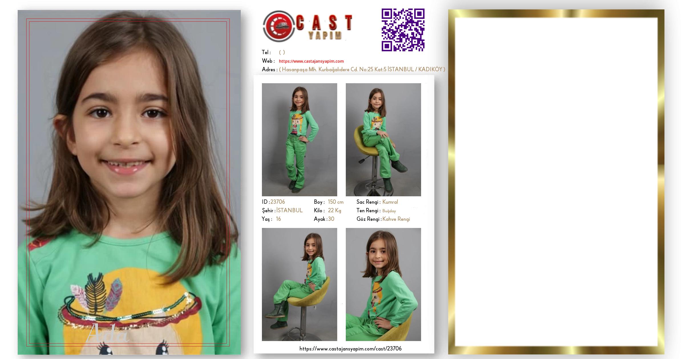 Merhaba, ben Ada . İSTANBUL şehrinde yaşıyorum ve 16 yaşındayım. Genel özelliklerim arasında boyum 150 cm, kilom 22 kg, saç rengim Kumral, göz rengim Kahve Rengi, ten rengim Buğday.