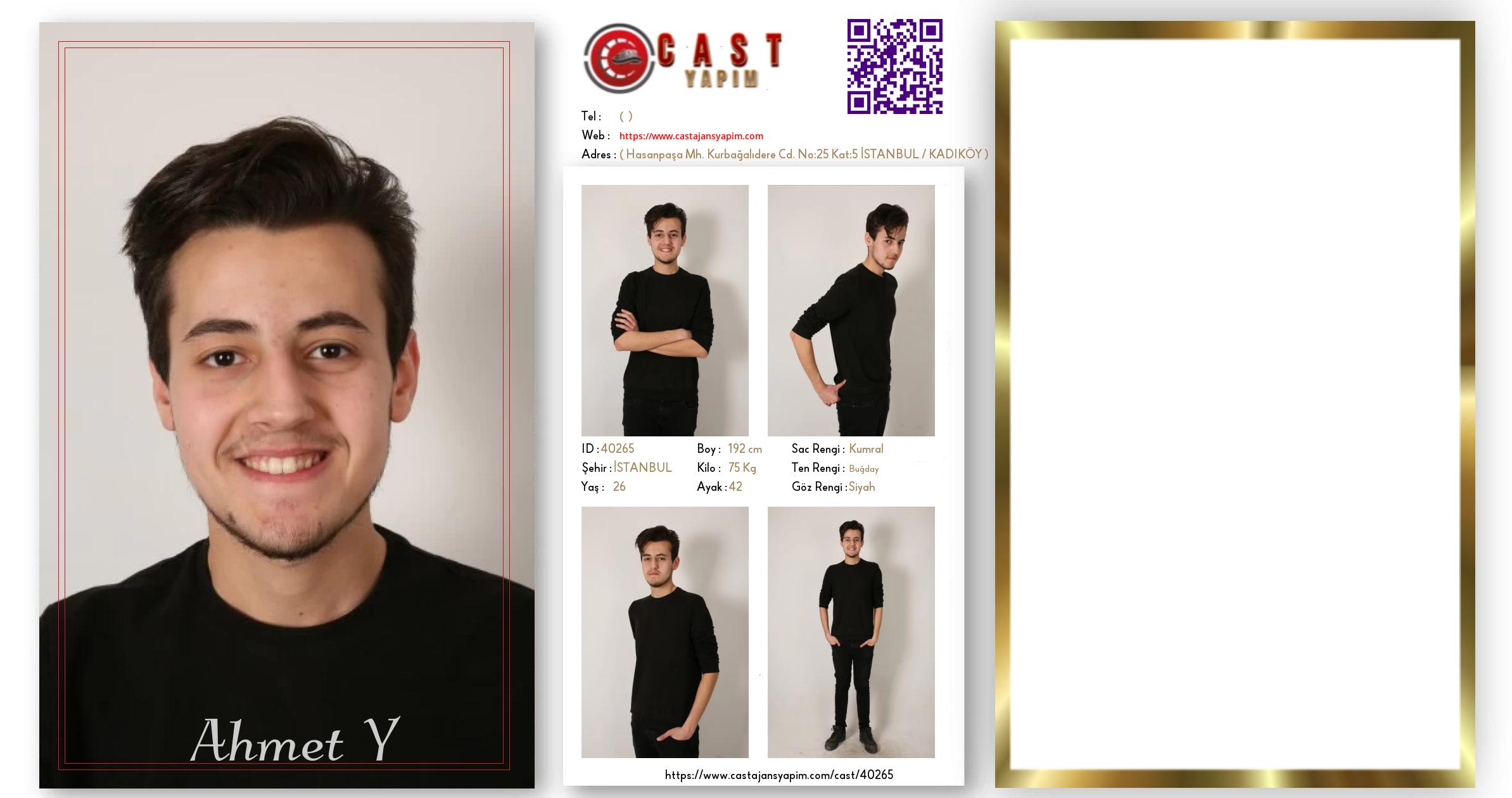 Merhaba, ben Ahmet. İSTANBUL şehrinde yaşıyorum ve 26 yaşındayım. Genel özelliklerim arasında boyum 192 cm, kilom 75 kg, saç rengim Kumral, göz rengim Siyah, ten rengim Buğday.