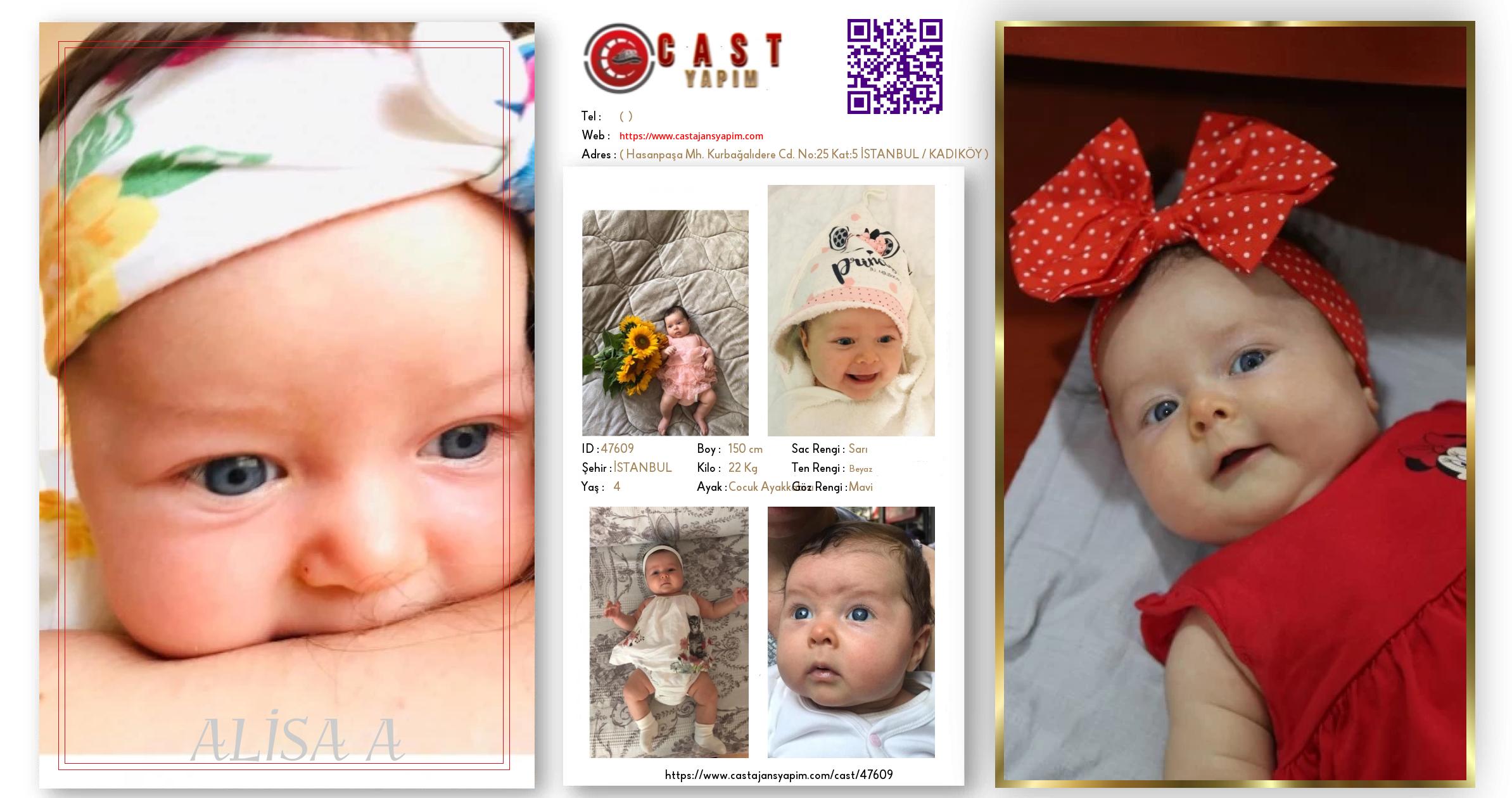 Merhaba, ben ALİSA A. İSTANBUL şehrinde yaşıyorum ve 4 yaşındayım. Genel özelliklerim arasında boyum 150 cm, kilom 22 kg, saç rengim Sarı, göz rengim Mavi, ten rengim Beyaz.