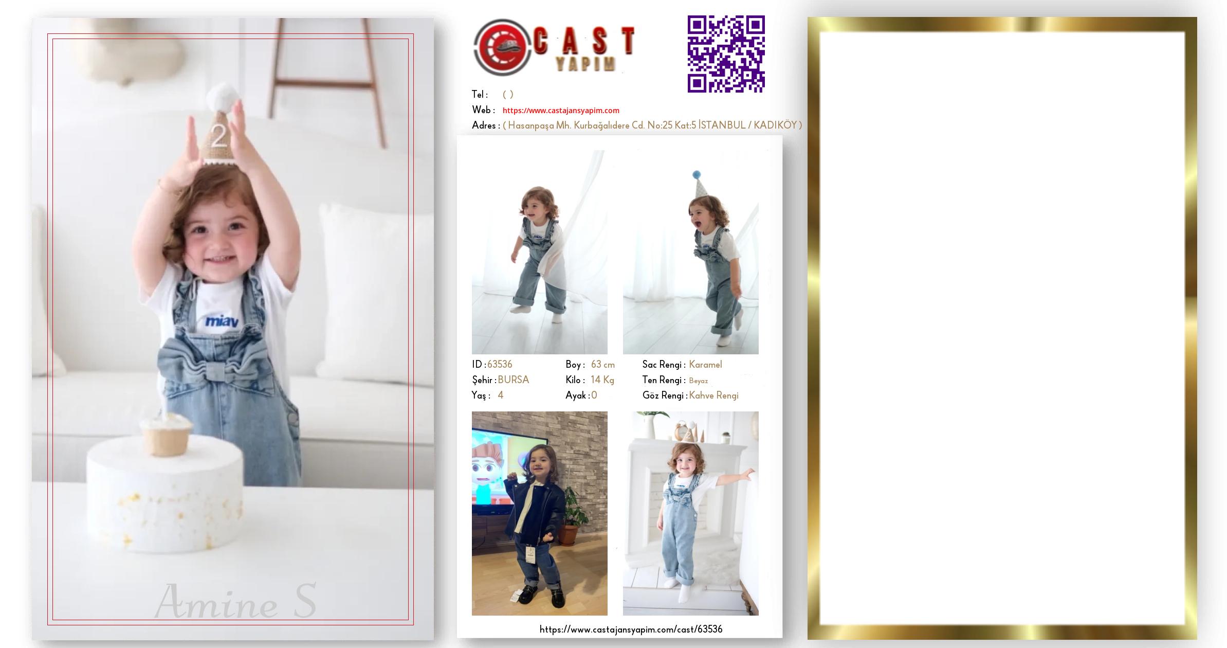 Merhaba, ben Amine S. BURSA şehrinde yaşıyorum ve 4 yaşındayım. Genel özelliklerim arasında boyum 63 cm, kilom 14 kg, saç rengim Karamel, göz rengim Kahve Rengi, ten rengim Beyaz.