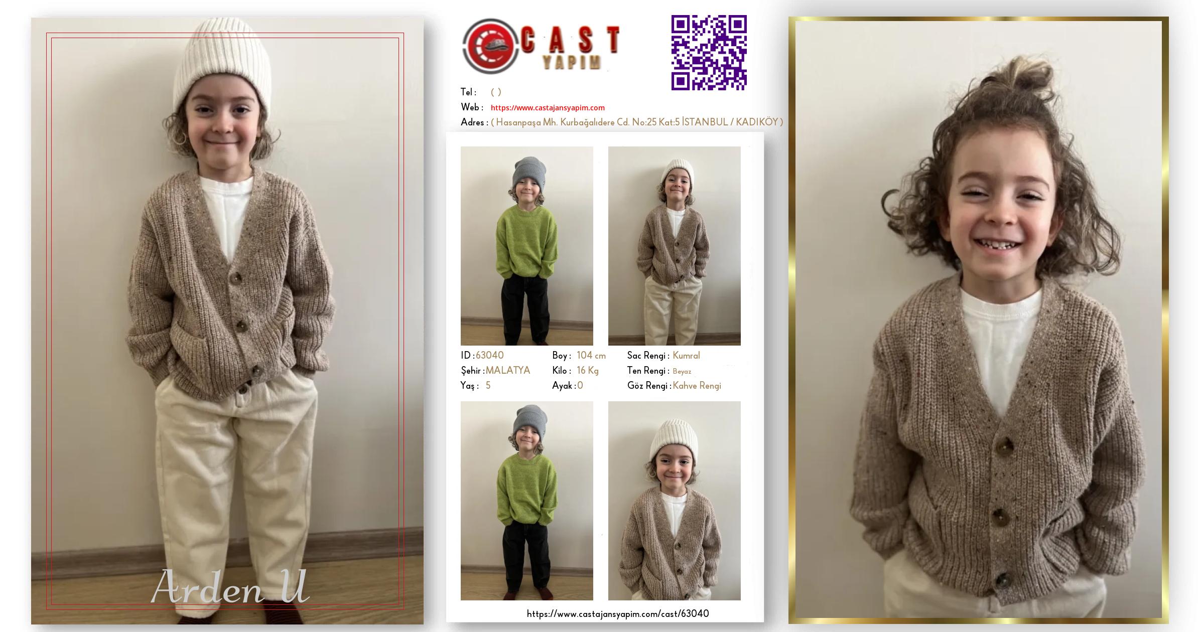Merhaba, ben Arden U. MALATYA şehrinde yaşıyorum ve 5 yaşındayım. Genel özelliklerim arasında boyum 104 cm, kilom 16 kg, saç rengim Kumral, göz rengim Kahve Rengi, ten rengim Beyaz.