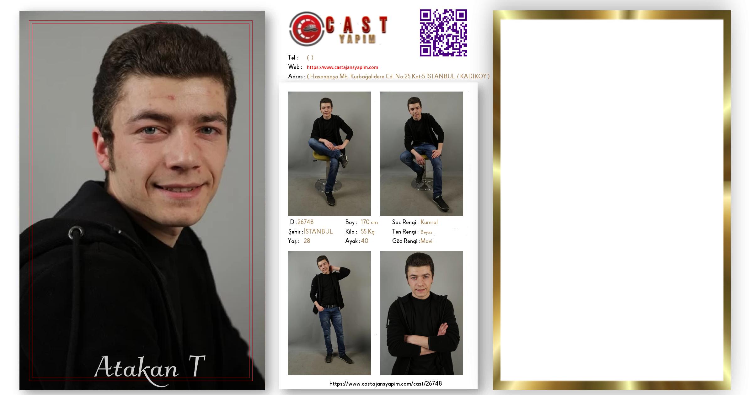 Merhaba, ben Atakan. İSTANBUL şehrinde yaşıyorum ve 28 yaşındayım. Genel özelliklerim arasında boyum 170 cm, kilom 55 kg, saç rengim Kumral, göz rengim Mavi, ten rengim Beyaz.
