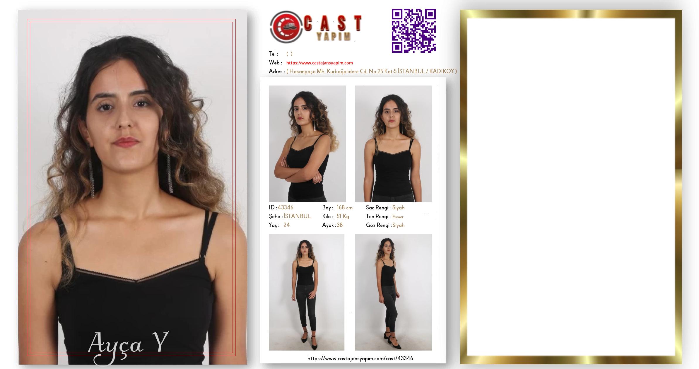 Merhaba, ben Ayça Y. İSTANBUL şehrinde yaşıyorum ve 24 yaşındayım. Genel özelliklerim arasında boyum 168 cm, kilom 51 kg, saç rengim Siyah, göz rengim Siyah, ten rengim Esmer.