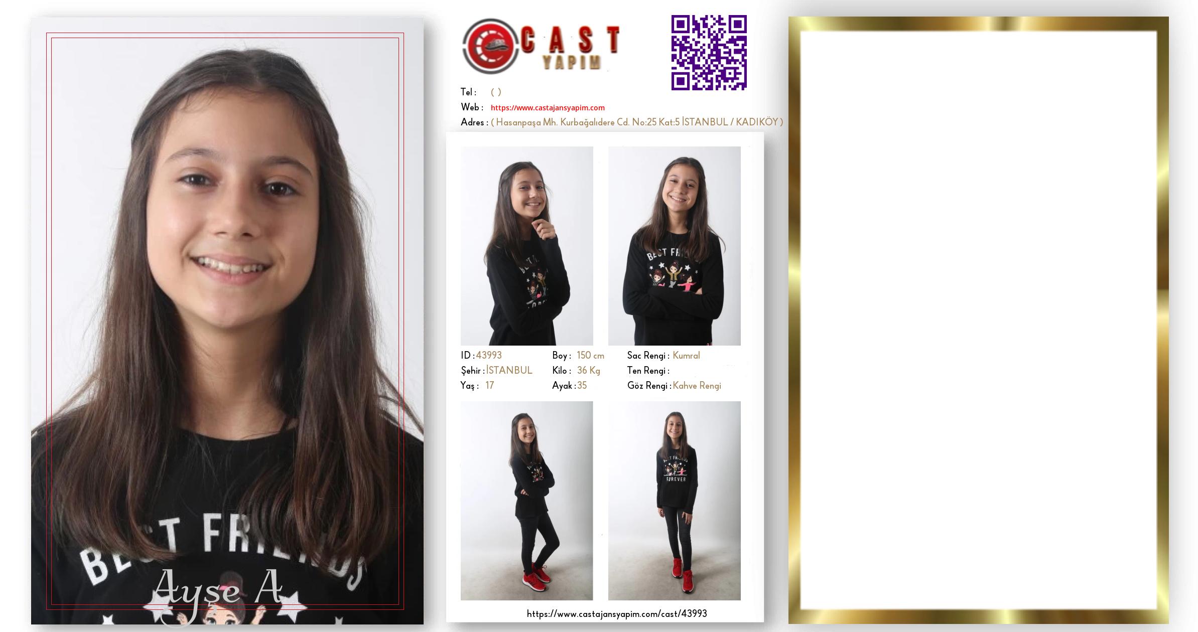 Merhaba, ben Ayşe A. İSTANBUL şehrinde yaşıyorum ve 17 yaşındayım. Genel özelliklerim arasında boyum 150 cm, kilom 36 kg, saç rengim Kumral, göz rengim Kahve Rengi.