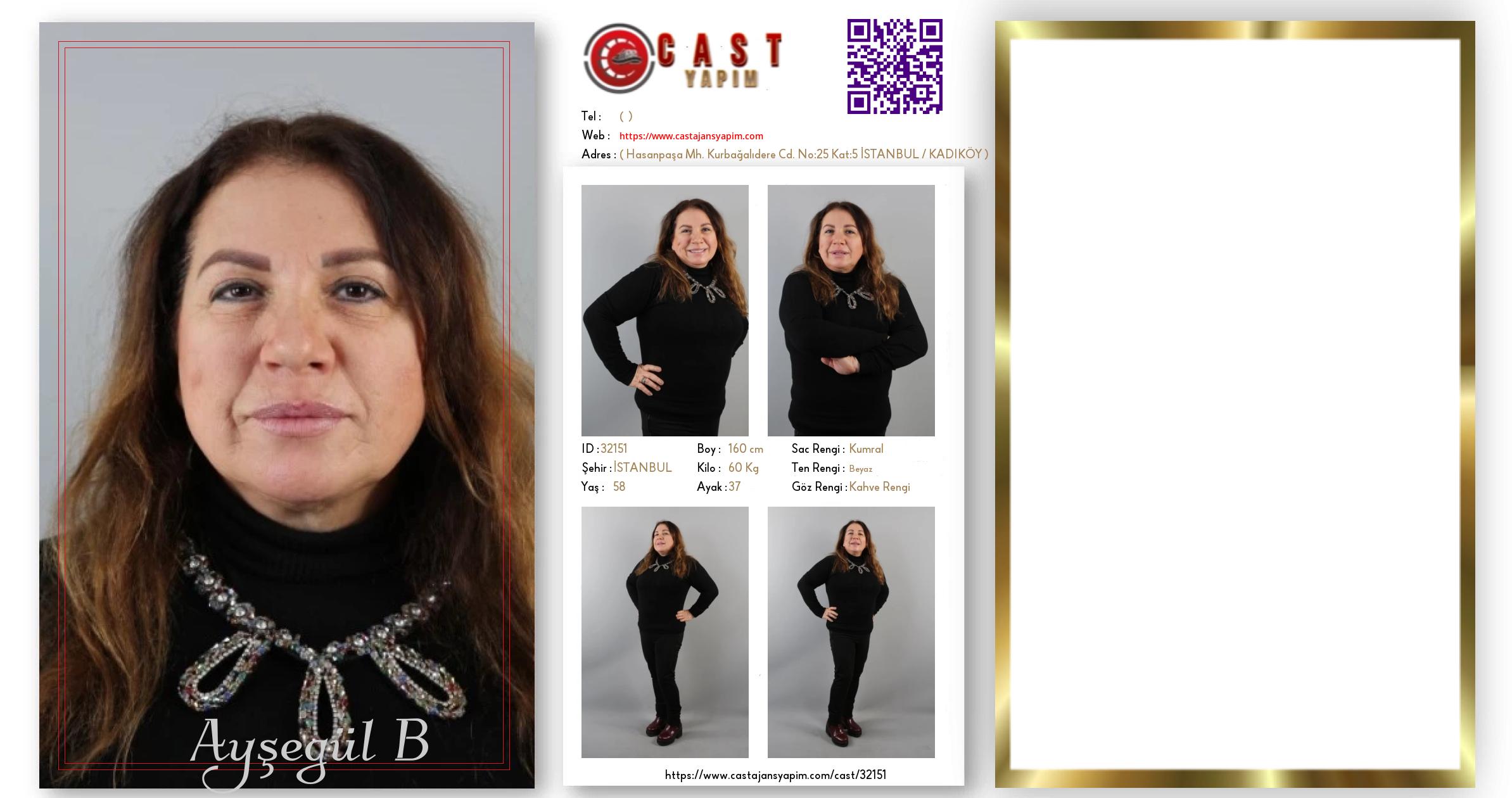 Merhaba, ben Ayşegül B. İSTANBUL şehrinde yaşıyorum ve 58 yaşındayım. Genel özelliklerim arasında boyum 160 cm, kilom 60 kg, saç rengim Kumral, göz rengim Kahve Rengi, ten rengim Beyaz.