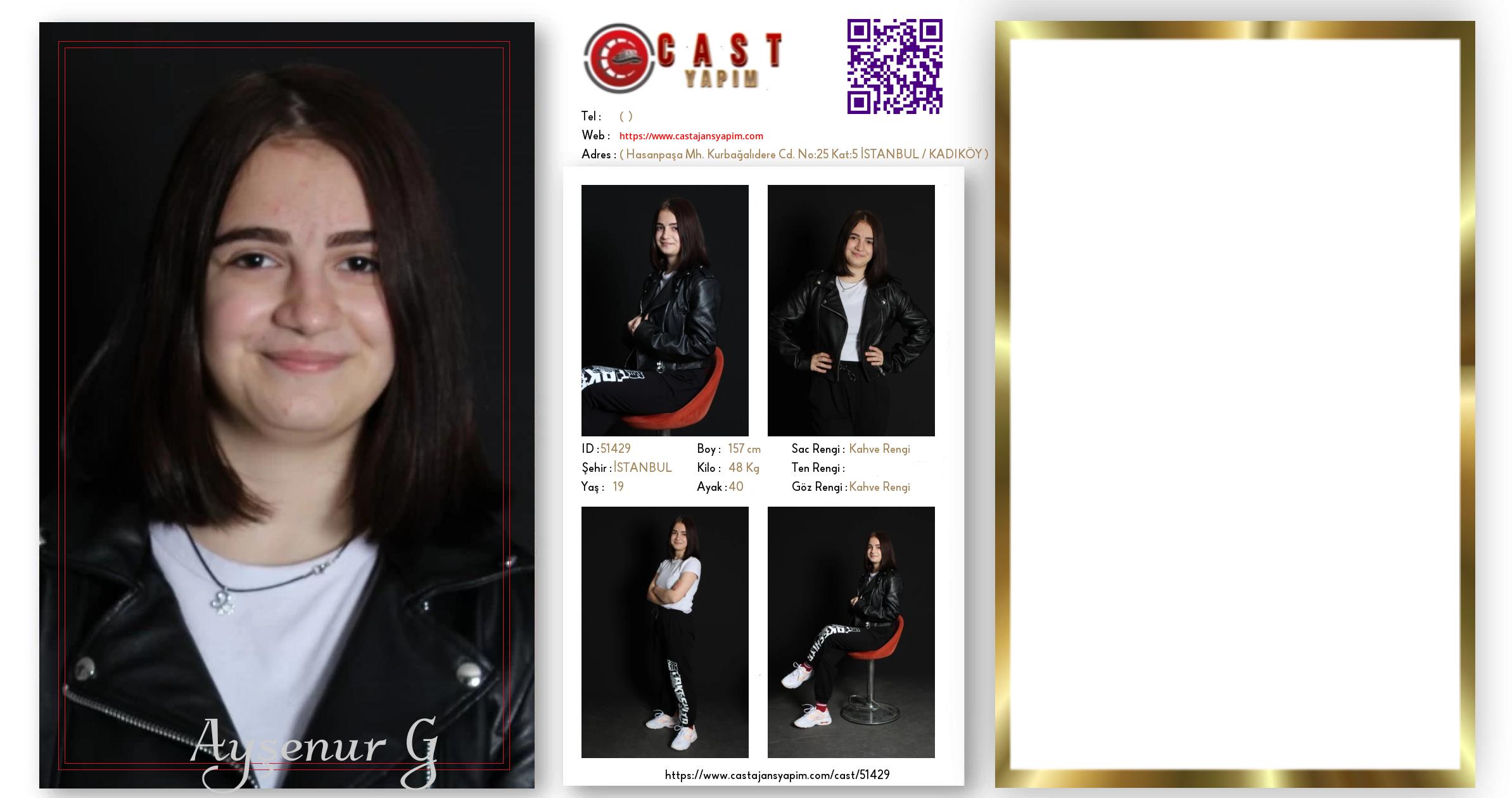 Merhaba, ben Ayşenur. İSTANBUL şehrinde yaşıyorum ve 19 yaşındayım. Genel özelliklerim arasında boyum 157 cm, kilom 48 kg, saç rengim Kahve Rengi, göz rengim Kahve Rengi.