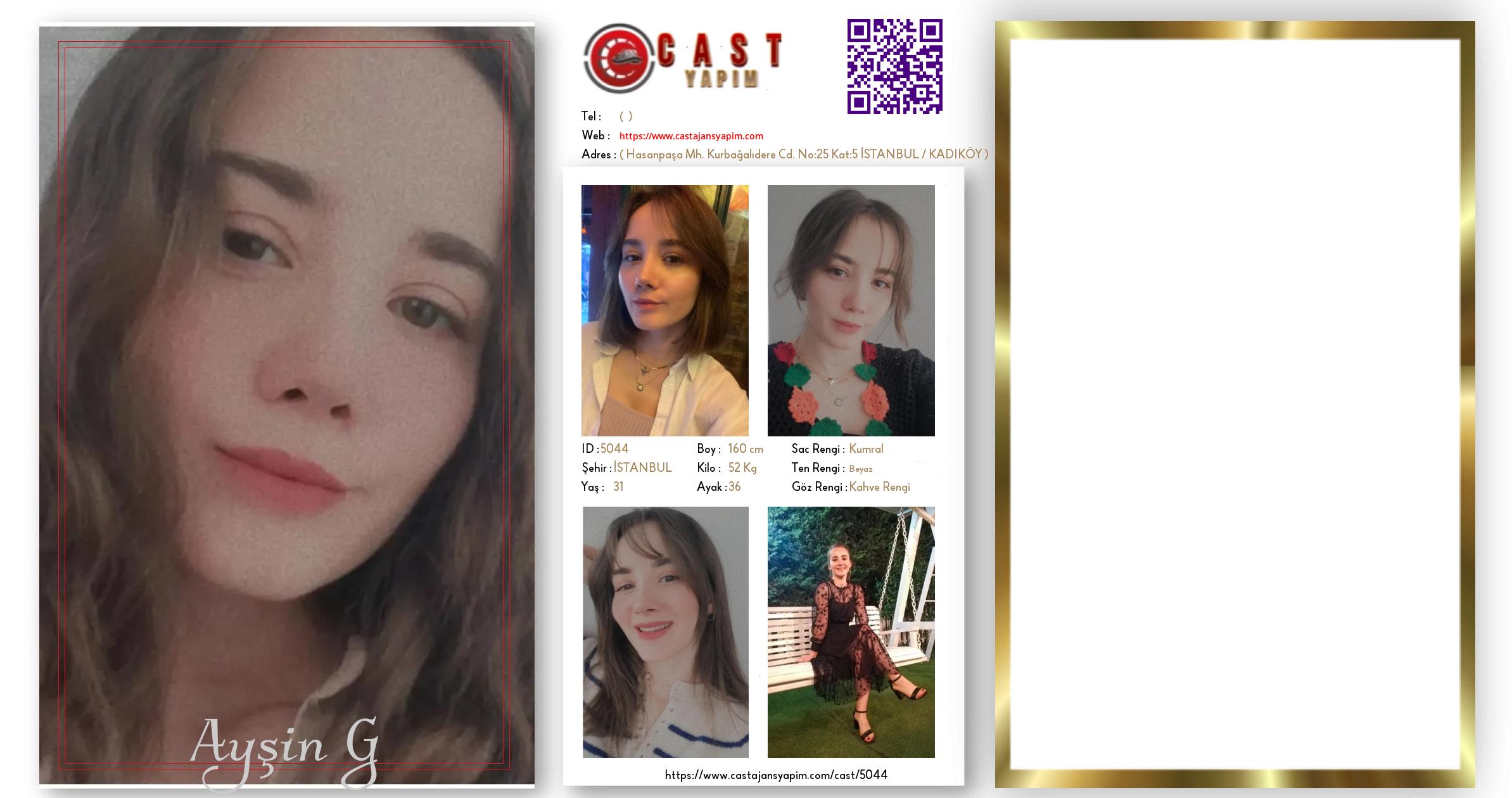 Merhaba, ben Ayşin G. İSTANBUL şehrinde yaşıyorum ve 31 yaşındayım. Genel özelliklerim arasında boyum 160 cm, kilom 52 kg, saç rengim Kumral, göz rengim Kahve Rengi, ten rengim Beyaz.
