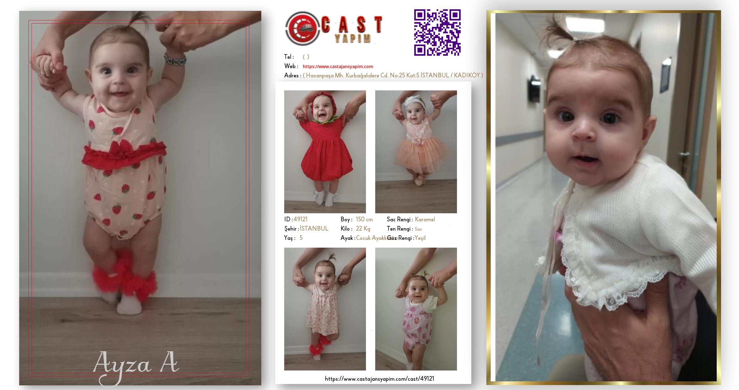 Merhaba, ben Ayza A. İSTANBUL şehrinde yaşıyorum ve 5 yaşındayım. Genel özelliklerim arasında boyum 150 cm, kilom 22 kg, saç rengim Karamel, göz rengim Yeşil, ten rengim Sarı.