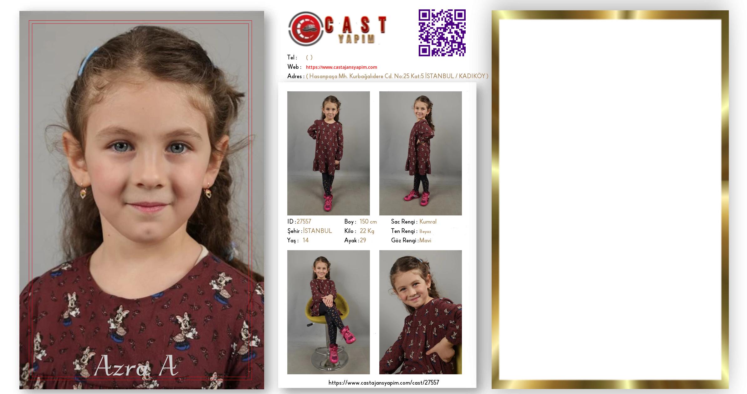 Merhaba, ben Azra A. İSTANBUL şehrinde yaşıyorum ve 14 yaşındayım. Genel özelliklerim arasında boyum 150 cm, kilom 22 kg, saç rengim Kumral, göz rengim Mavi, ten rengim Beyaz.