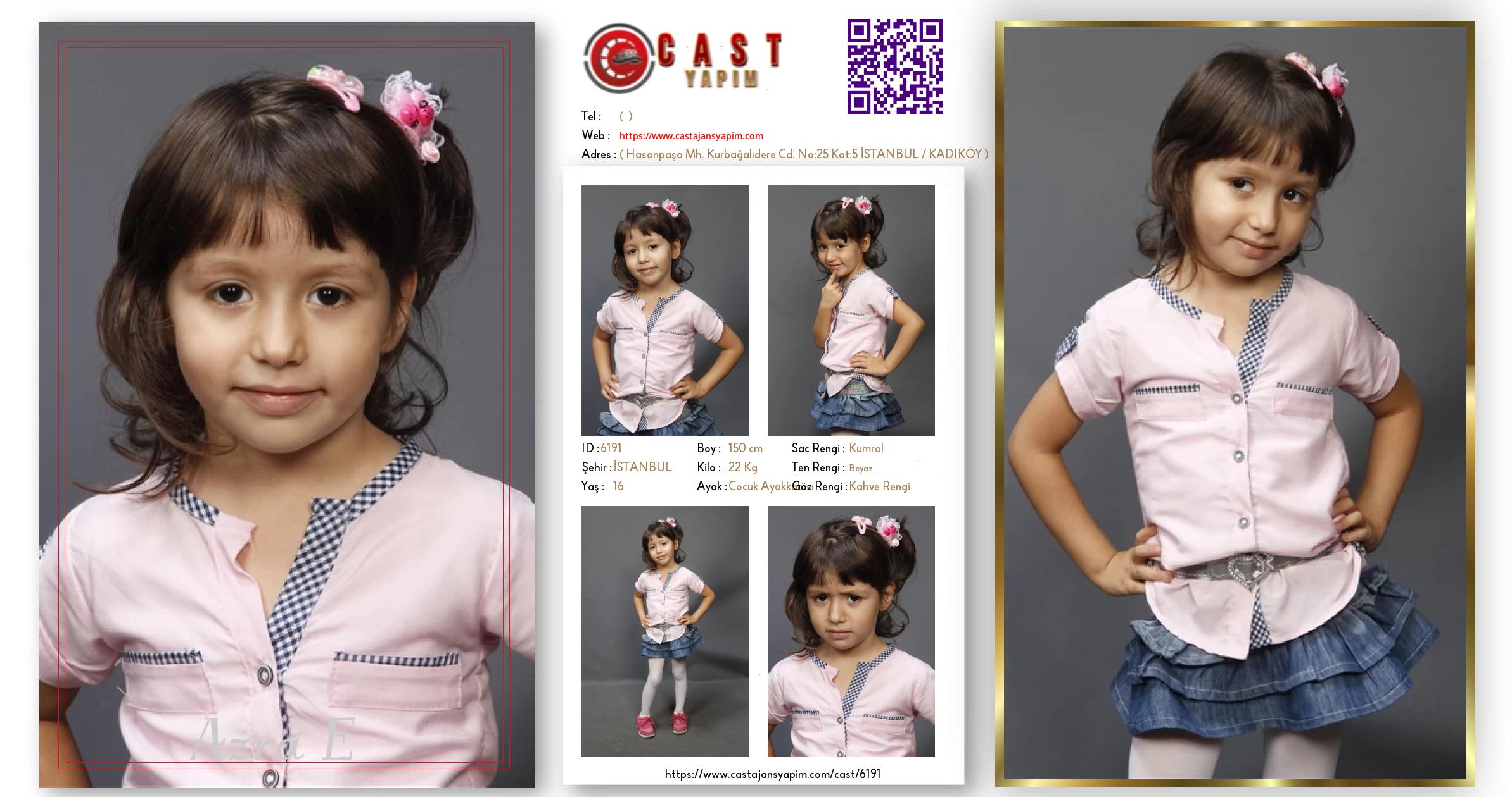 Merhaba, ben Azra E. İSTANBUL şehrinde yaşıyorum ve 16 yaşındayım. Genel özelliklerim arasında boyum 150 cm, kilom 22 kg, saç rengim Kumral, göz rengim Kahve Rengi, ten rengim Beyaz.