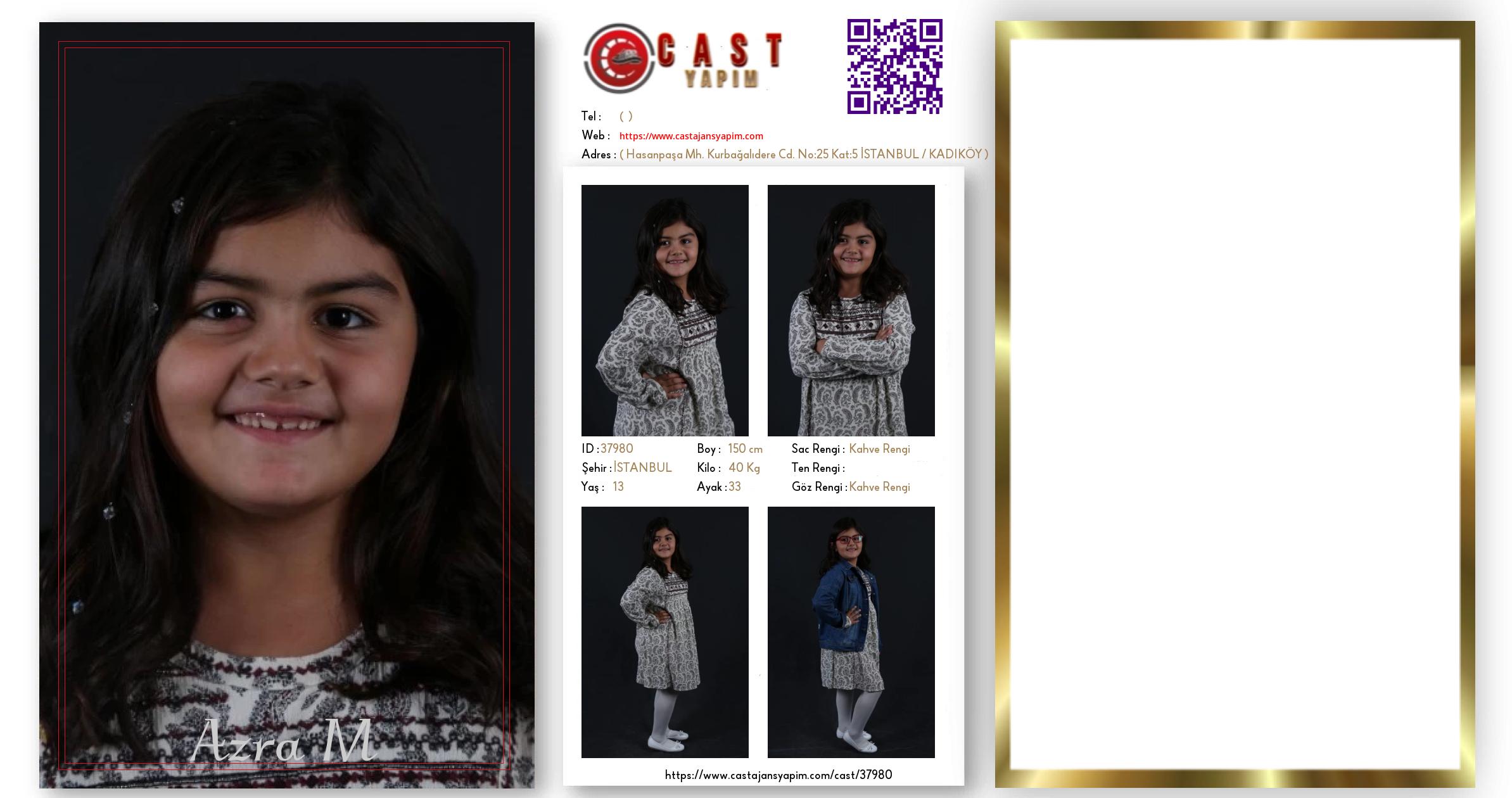 Merhaba, ben Azra Beren. İSTANBUL şehrinde yaşıyorum ve 13 yaşındayım. Genel özelliklerim arasında boyum 150 cm, kilom 40 kg, saç rengim Kahve Rengi, göz rengim Kahve Rengi.