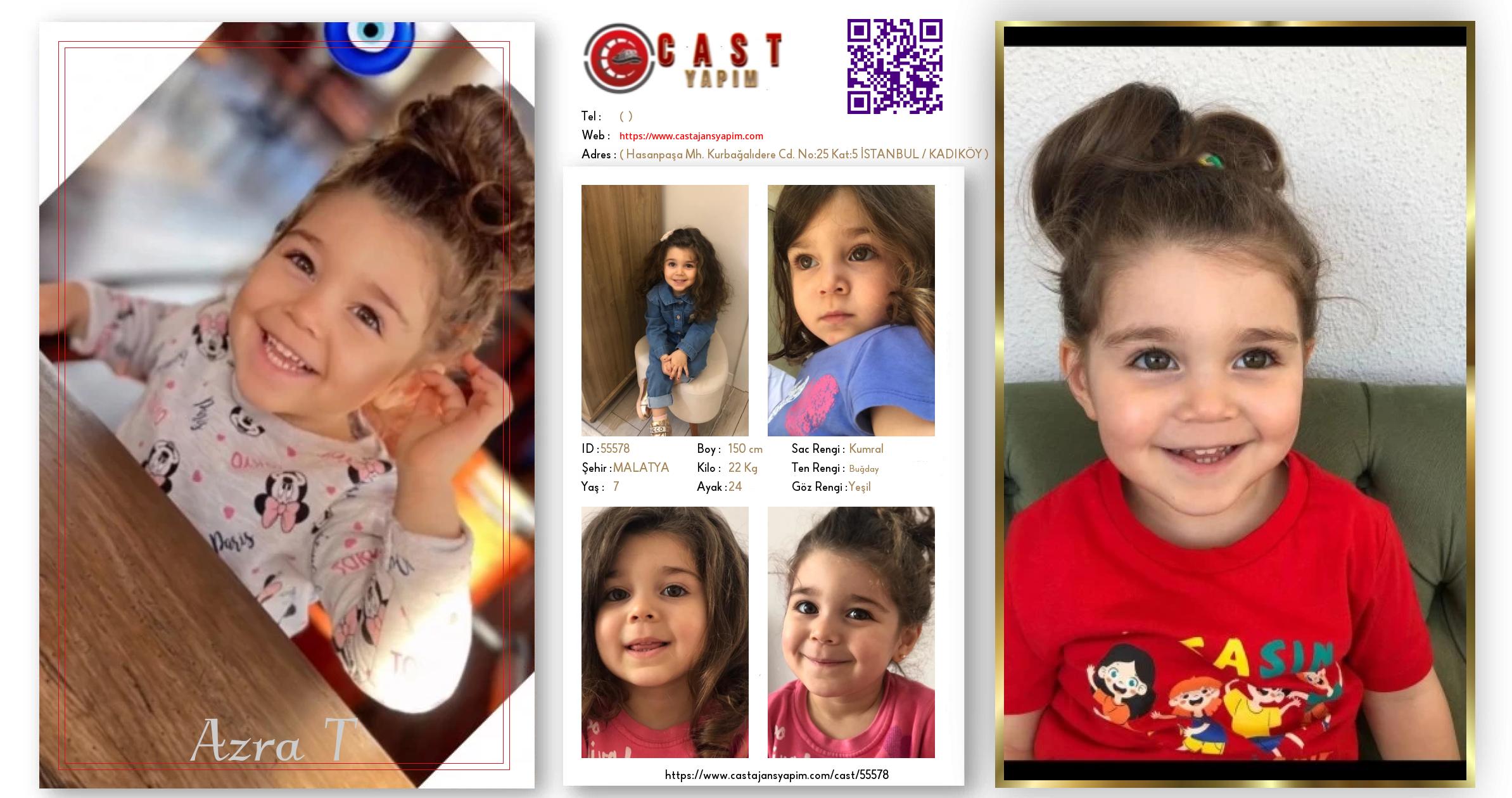 Merhaba, ben Azra. MALATYA şehrinde yaşıyorum ve 7 yaşındayım. Genel özelliklerim arasında boyum 150 cm, kilom 22 kg, saç rengim Kumral, göz rengim Yeşil, ten rengim Buğday.