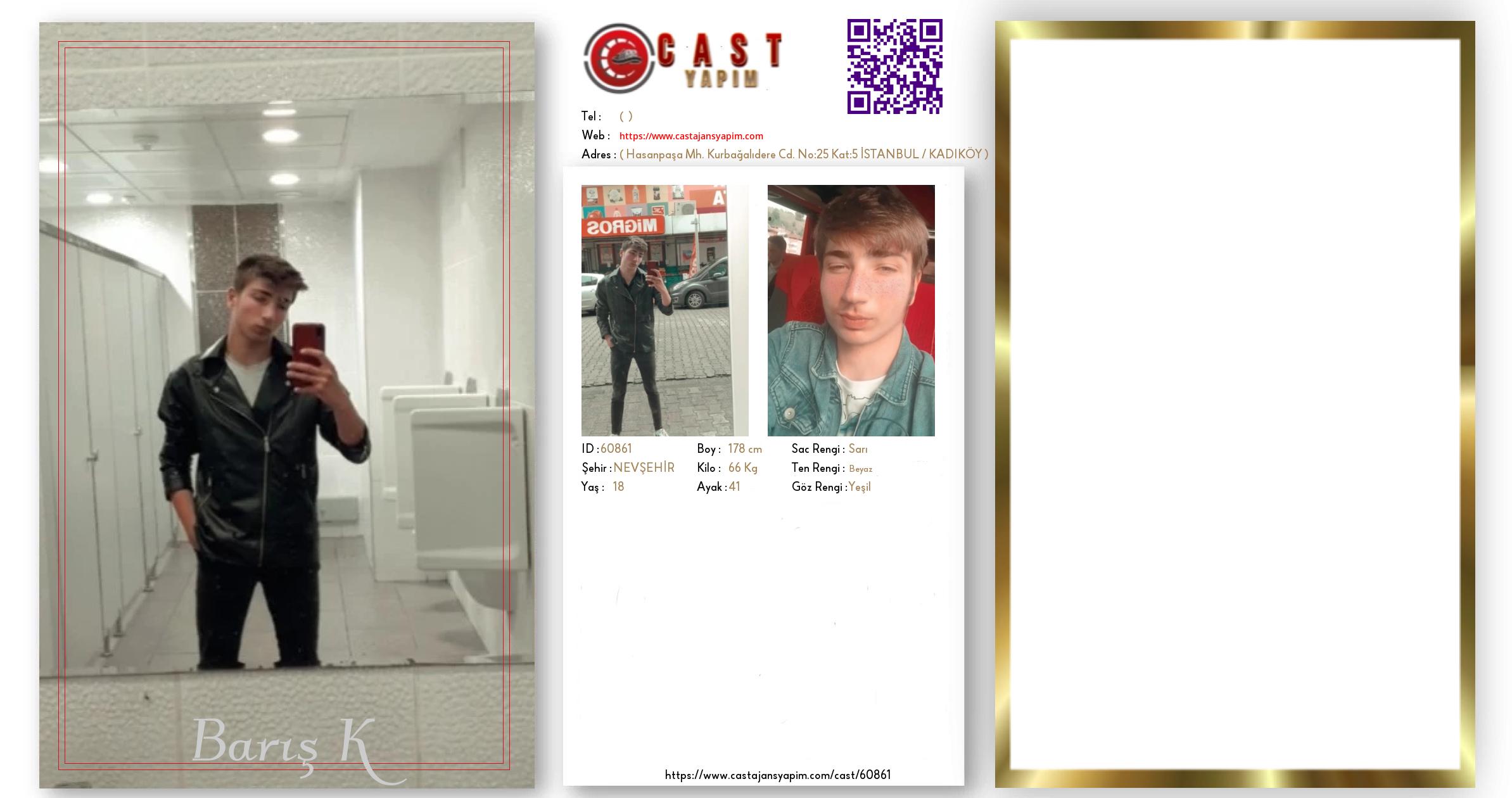 Merhaba, ben Barış K. NEVŞEHİR şehrinde yaşıyorum ve 18 yaşındayım. Genel özelliklerim arasında boyum 178 cm, kilom 66 kg, saç rengim Sarı, göz rengim Yeşil, ten rengim Beyaz.