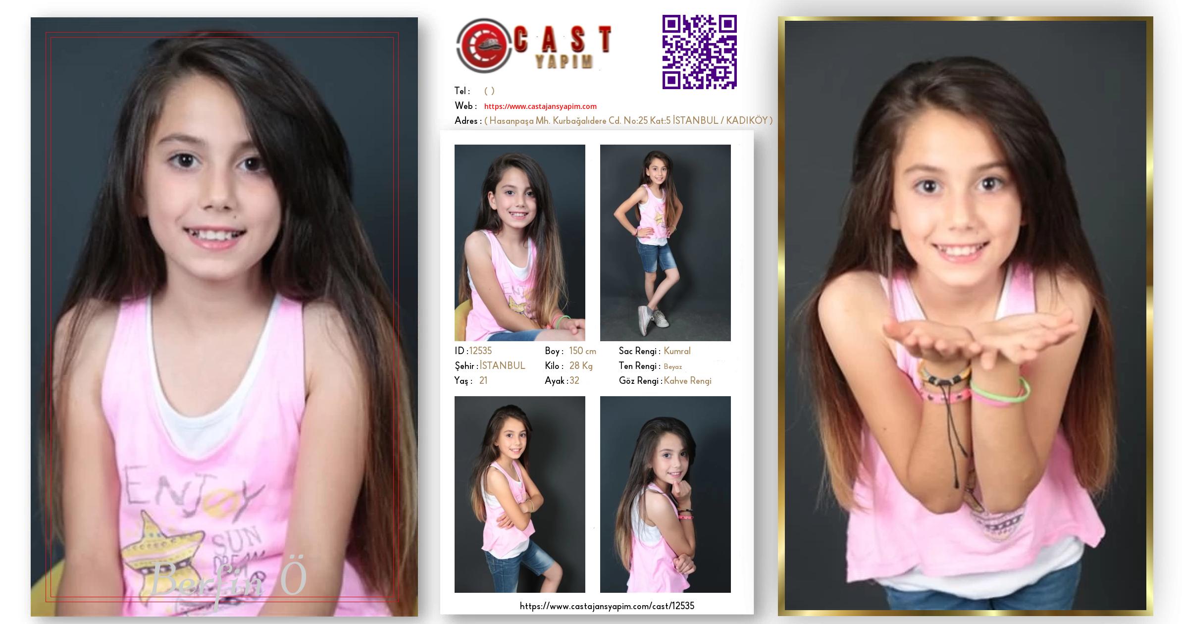 Merhaba, ben Berfin. İSTANBUL şehrinde yaşıyorum ve 21 yaşındayım. Genel özelliklerim arasında boyum 150 cm, kilom 28 kg, saç rengim Kumral, göz rengim Kahve Rengi, ten rengim Beyaz.