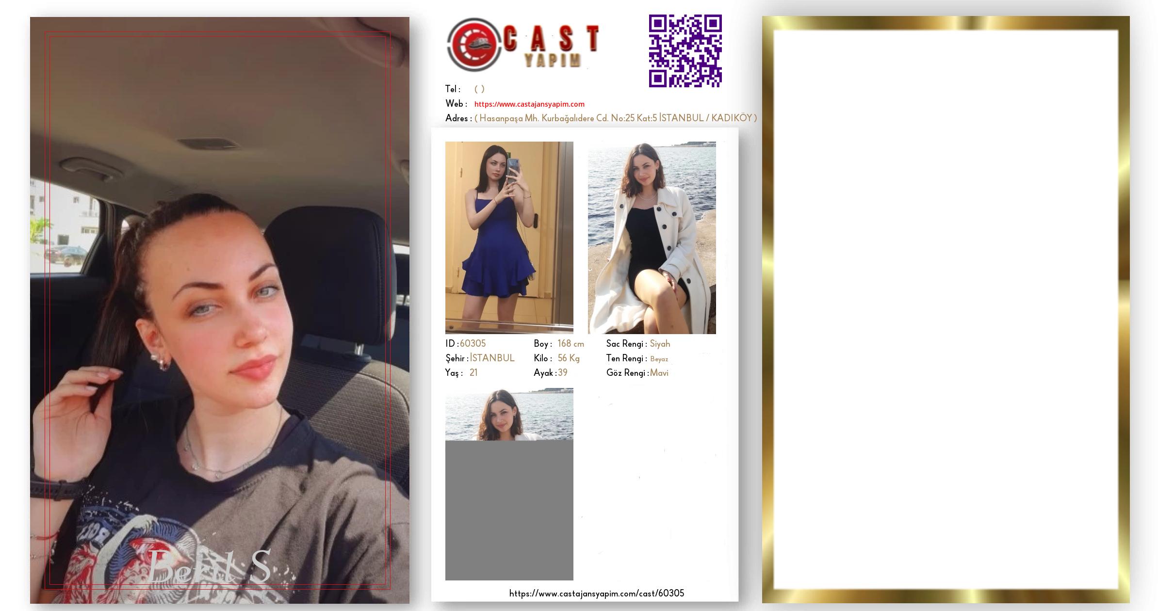 Merhaba, ben Beril S. İSTANBUL şehrinde yaşıyorum ve 21 yaşındayım. Genel özelliklerim arasında boyum 168 cm, kilom 56 kg, saç rengim Siyah, göz rengim Mavi, ten rengim Beyaz.