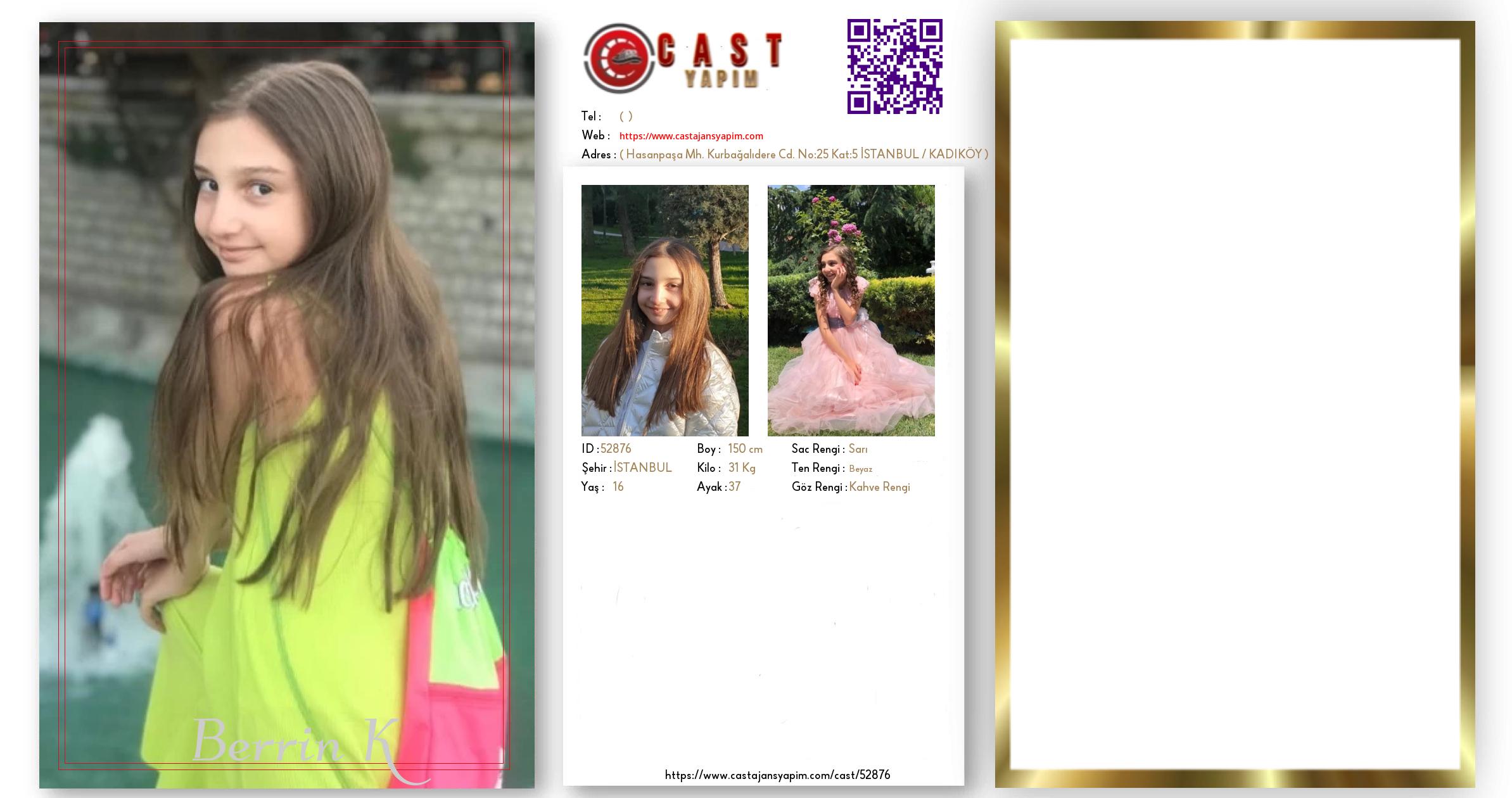 Merhaba, ben Berrin K. İSTANBUL şehrinde yaşıyorum ve 16 yaşındayım. Genel özelliklerim arasında boyum 150 cm, kilom 31 kg, saç rengim Sarı, göz rengim Kahve Rengi, ten rengim Beyaz.