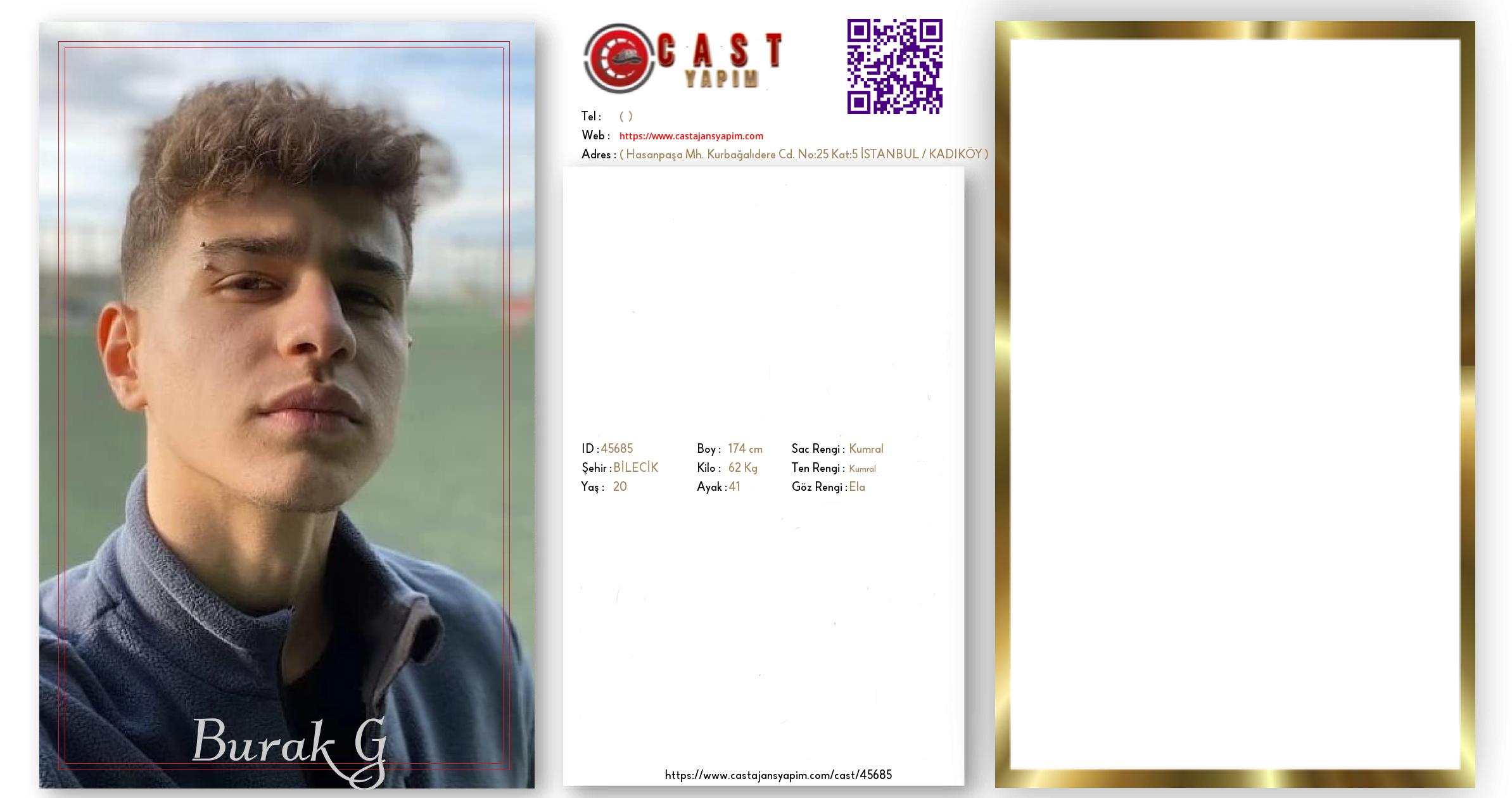 Merhaba, ben Burak. BİLECİK şehrinde yaşıyorum ve 20 yaşındayım. Genel özelliklerim arasında boyum 174 cm, kilom 62 kg, saç rengim Kumral, göz rengim Ela, ten rengim Kumral.