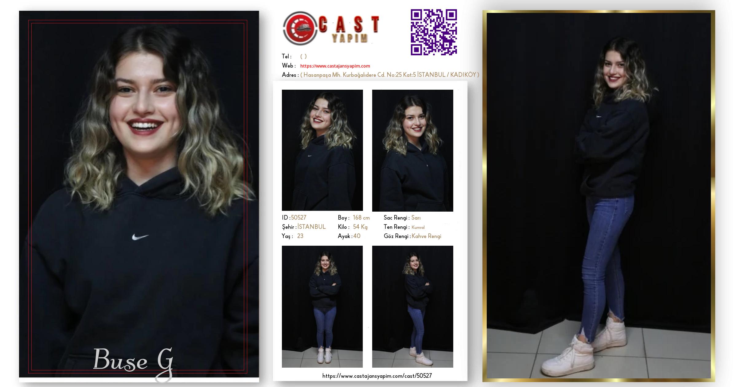 Merhaba, ben Buse. İSTANBUL şehrinde yaşıyorum ve 23 yaşındayım. Genel özelliklerim arasında boyum 168 cm, kilom 54 kg, saç rengim Sarı, göz rengim Kahve Rengi, ten rengim Kumral.