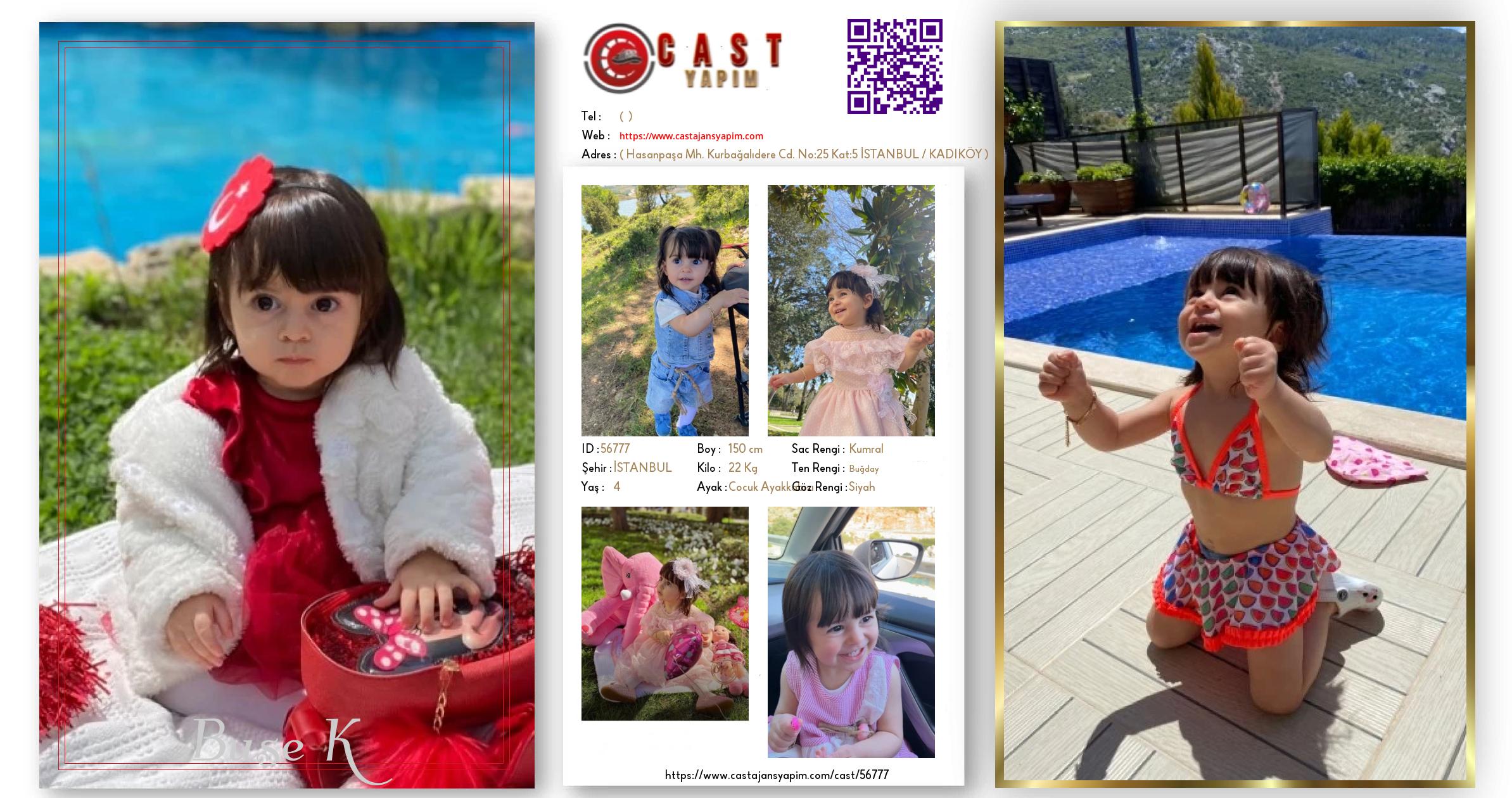 Merhaba, ben Buse K. İSTANBUL şehrinde yaşıyorum ve 4 yaşındayım. Genel özelliklerim arasında boyum 150 cm, kilom 22 kg, saç rengim Kumral, göz rengim Siyah, ten rengim Buğday.
