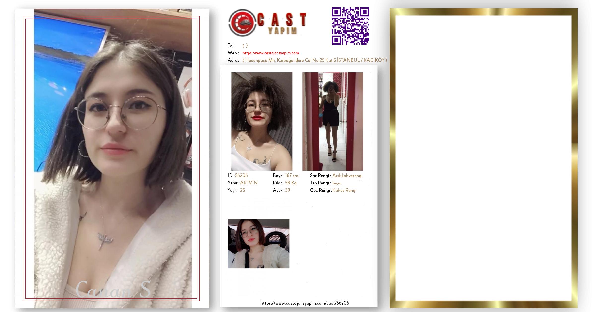 Merhaba, ben Canan. ARTVİN şehrinde yaşıyorum ve 25 yaşındayım. Genel özelliklerim arasında boyum 167 cm, kilom 58 kg, saç rengim Açık kahverengi, göz rengim Kahve Rengi, ten rengim Beyaz.