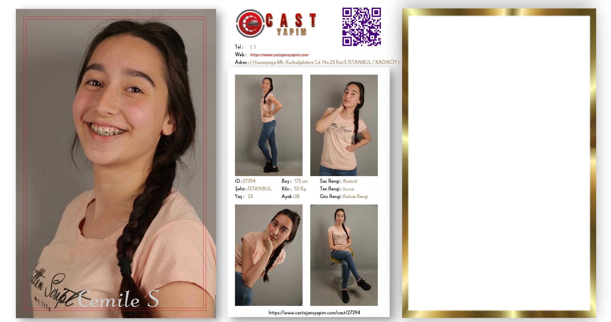 Merhaba, ben Cemile. İSTANBUL şehrinde yaşıyorum ve 23 yaşındayım. Genel özelliklerim arasında boyum 173 cm, kilom 53 kg, saç rengim Kumral, göz rengim Kahve Rengi, ten rengim Kumral.