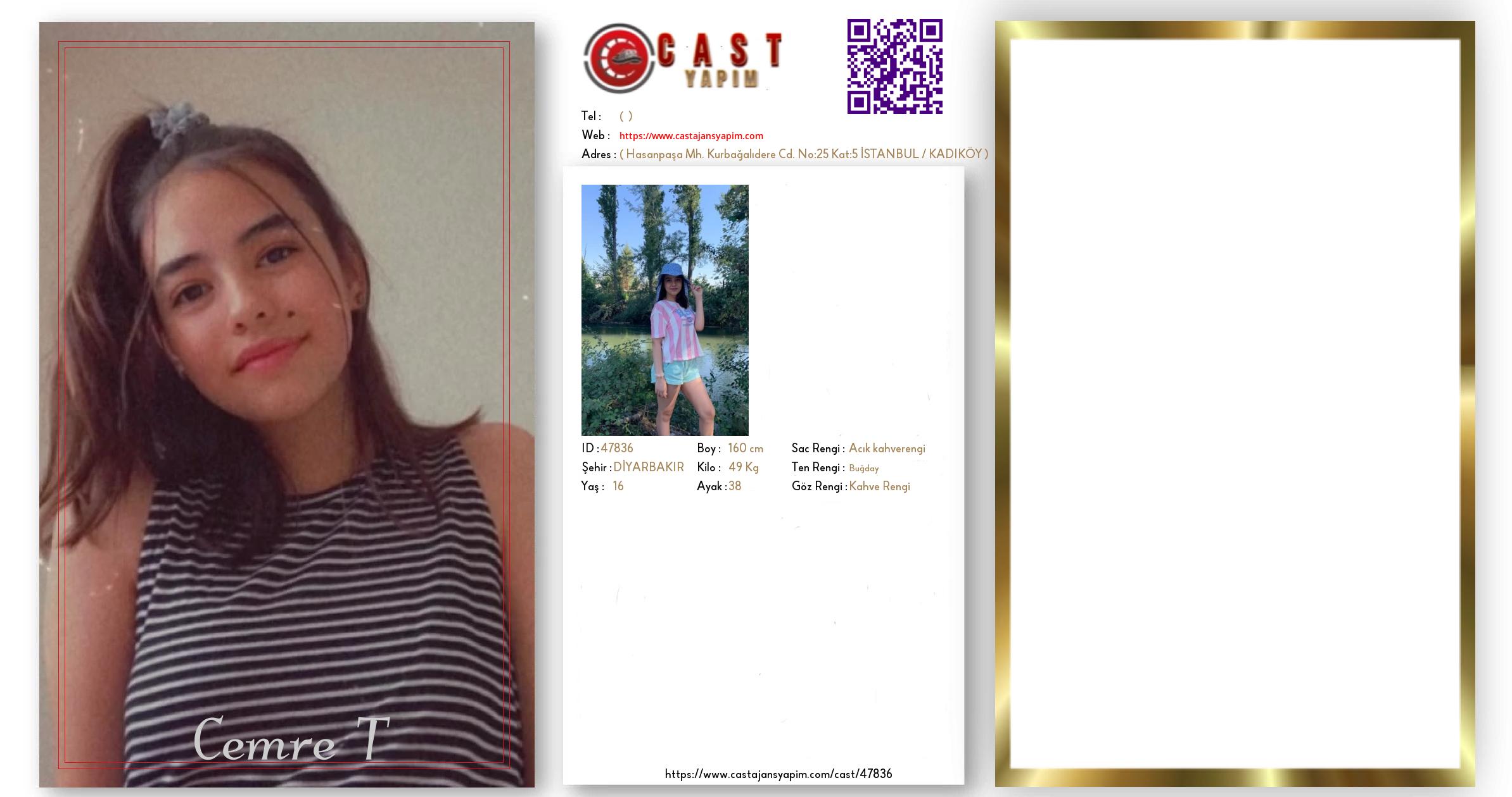 Merhaba, ben Cemre. DİYARBAKIR şehrinde yaşıyorum ve 16 yaşındayım. Genel özelliklerim arasında boyum 160 cm, kilom 49 kg, saç rengim Açık kahverengi, göz rengim Kahve Rengi, ten rengim Buğday.