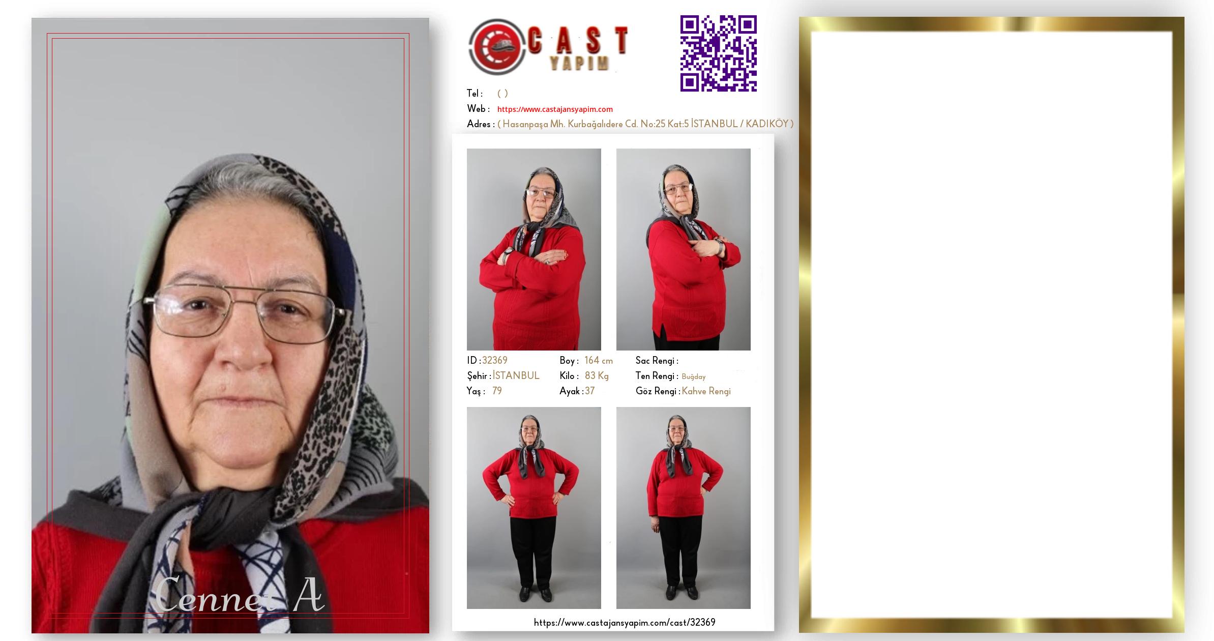 Merhaba, ben Cennet A. İSTANBUL şehrinde yaşıyorum ve 79 yaşındayım. Genel özelliklerim arasında boyum 164 cm, kilom 83 kg, göz rengim Kahve Rengi, ten rengim Buğday.