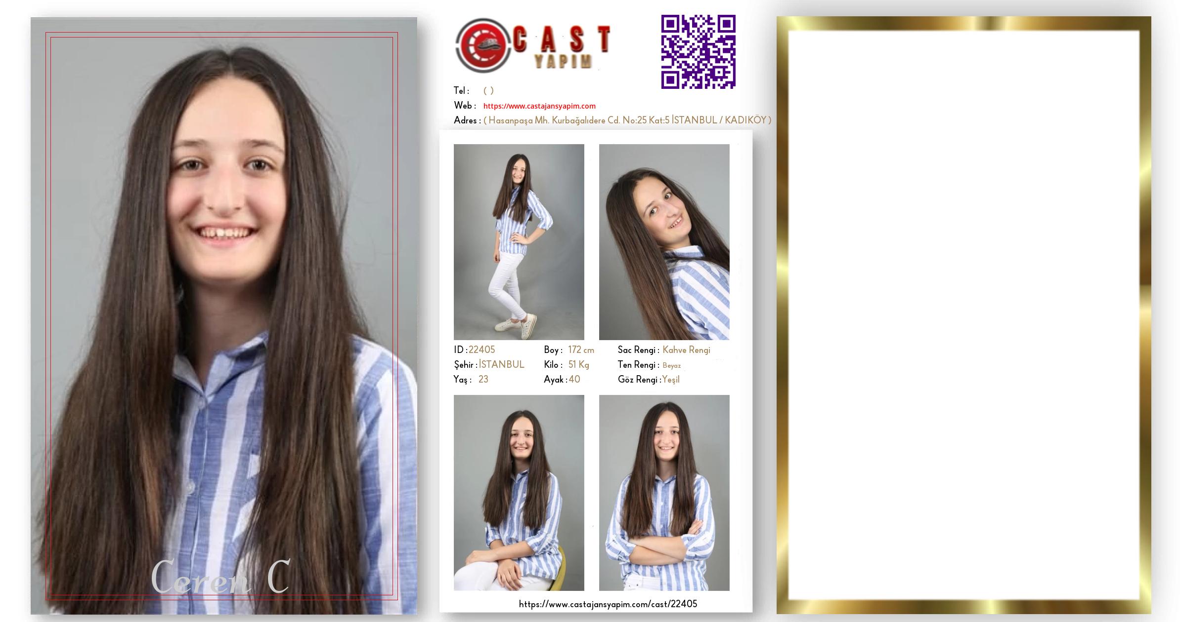 Merhaba, ben Ceren C. İSTANBUL şehrinde yaşıyorum ve 23 yaşındayım. Genel özelliklerim arasında boyum 172 cm, kilom 51 kg, saç rengim Kahve Rengi, göz rengim Yeşil, ten rengim Beyaz.