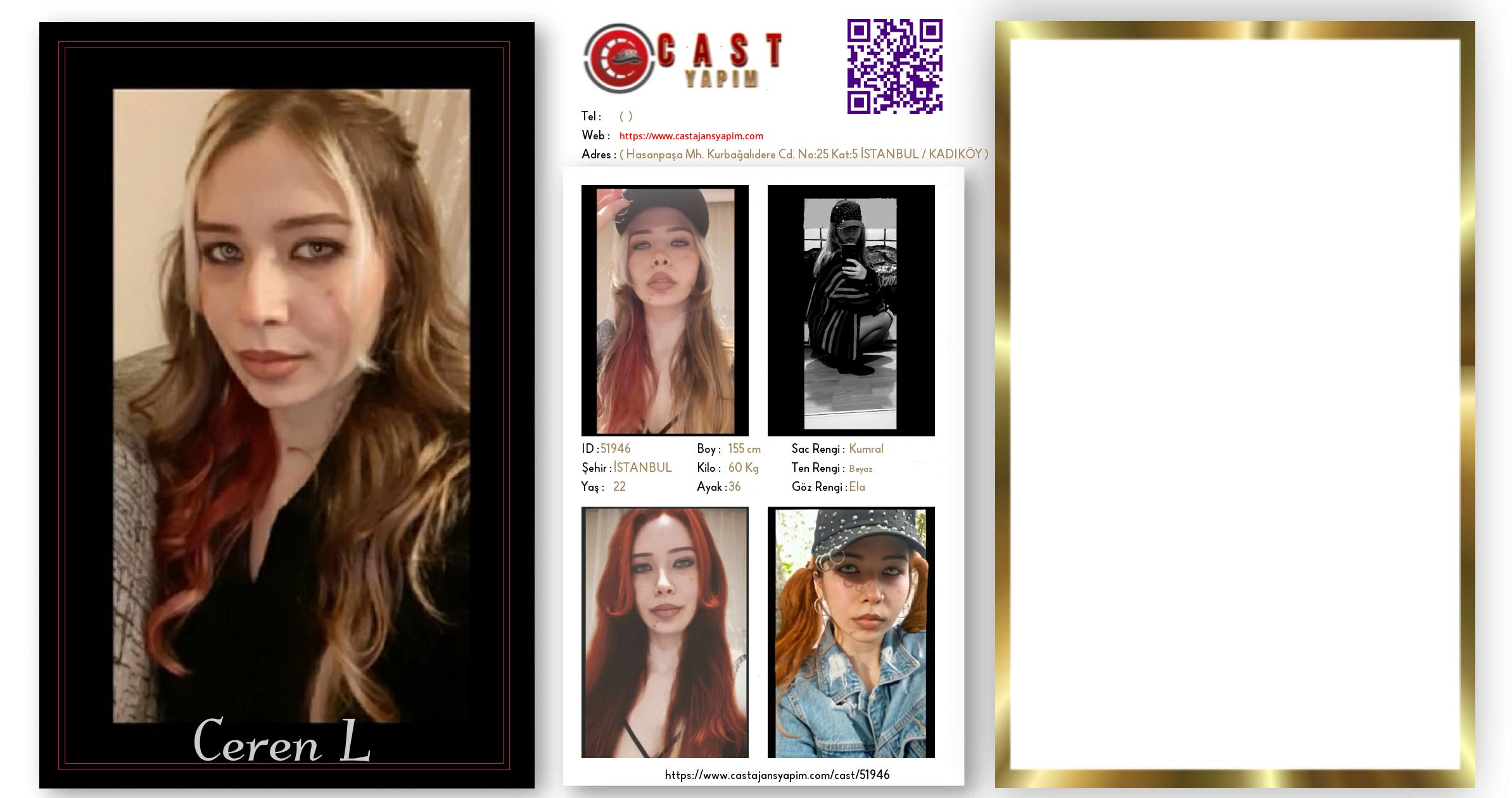 Merhaba, ben Ceren L. İSTANBUL şehrinde yaşıyorum ve 22 yaşındayım. Genel özelliklerim arasında boyum 155 cm, kilom 60 kg, saç rengim Kumral, göz rengim Ela, ten rengim Beyaz.