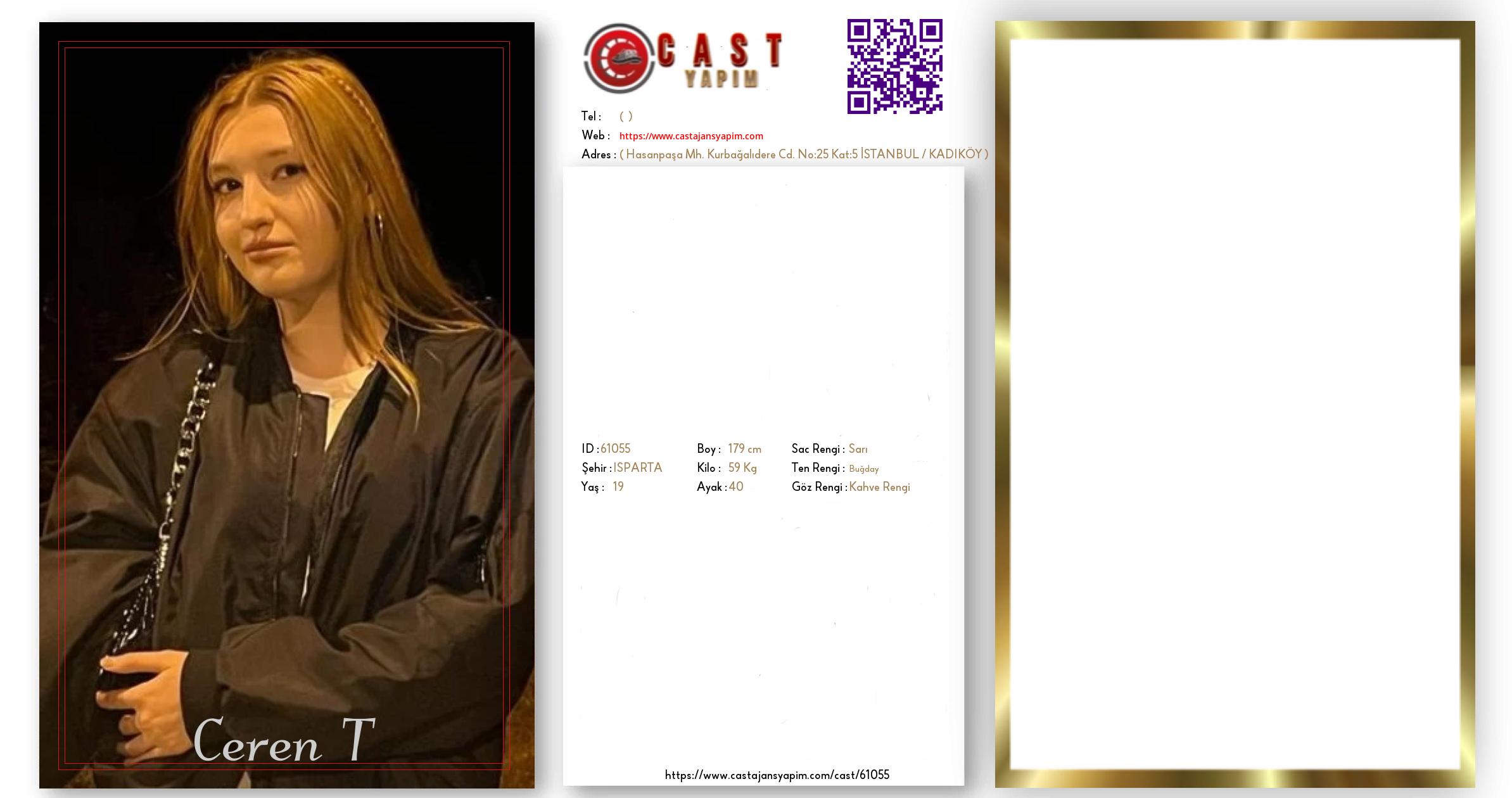 Merhaba, ben Ceren Mina. ISPARTA şehrinde yaşıyorum ve 19 yaşındayım. Genel özelliklerim arasında boyum 179 cm, kilom 59 kg, saç rengim Sarı, göz rengim Kahve Rengi, ten rengim Buğday.