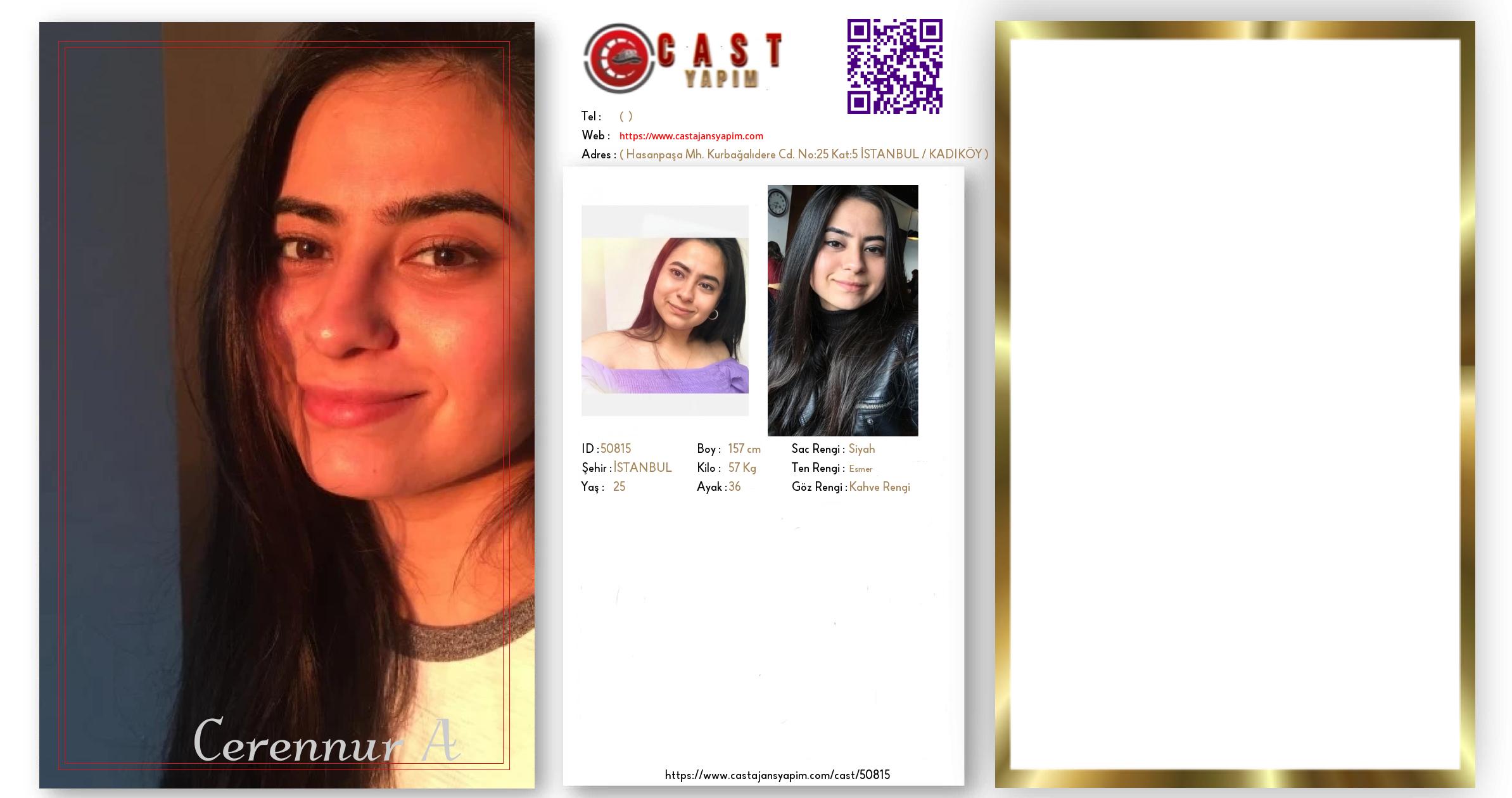 Merhaba, ben Cerennur. İSTANBUL şehrinde yaşıyorum ve 25 yaşındayım. Genel özelliklerim arasında boyum 157 cm, kilom 57 kg, saç rengim Siyah, göz rengim Kahve Rengi, ten rengim Esmer.
