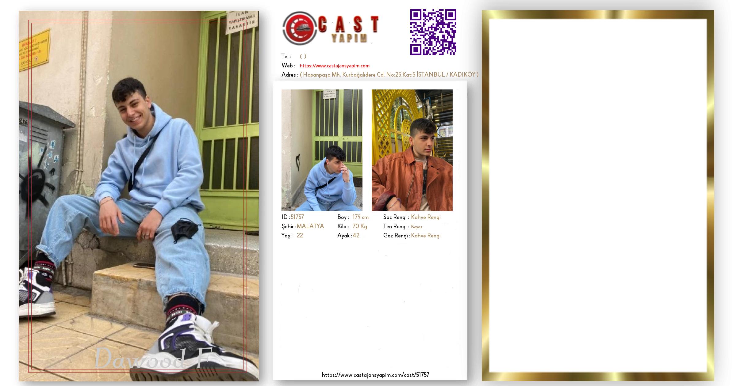 Merhaba, ben Dawood. MALATYA şehrinde yaşıyorum ve 22 yaşındayım. Genel özelliklerim arasında boyum 179 cm, kilom 70 kg, saç rengim Kahve Rengi, göz rengim Kahve Rengi, ten rengim Beyaz.