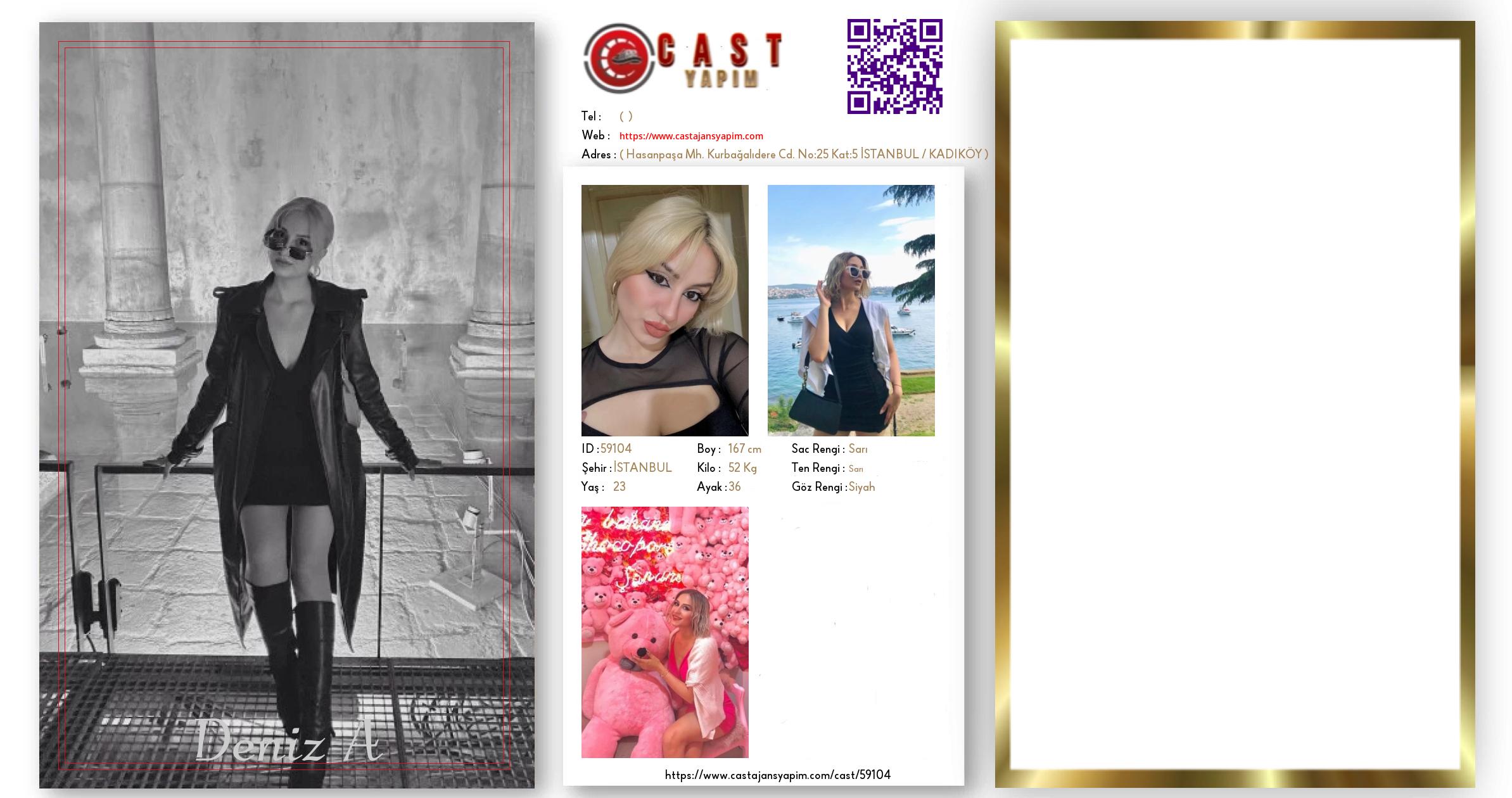 Merhaba, ben Deniz A. İSTANBUL şehrinde yaşıyorum ve 23 yaşındayım. Genel özelliklerim arasında boyum 167 cm, kilom 52 kg, saç rengim Sarı, göz rengim Siyah, ten rengim Sarı.