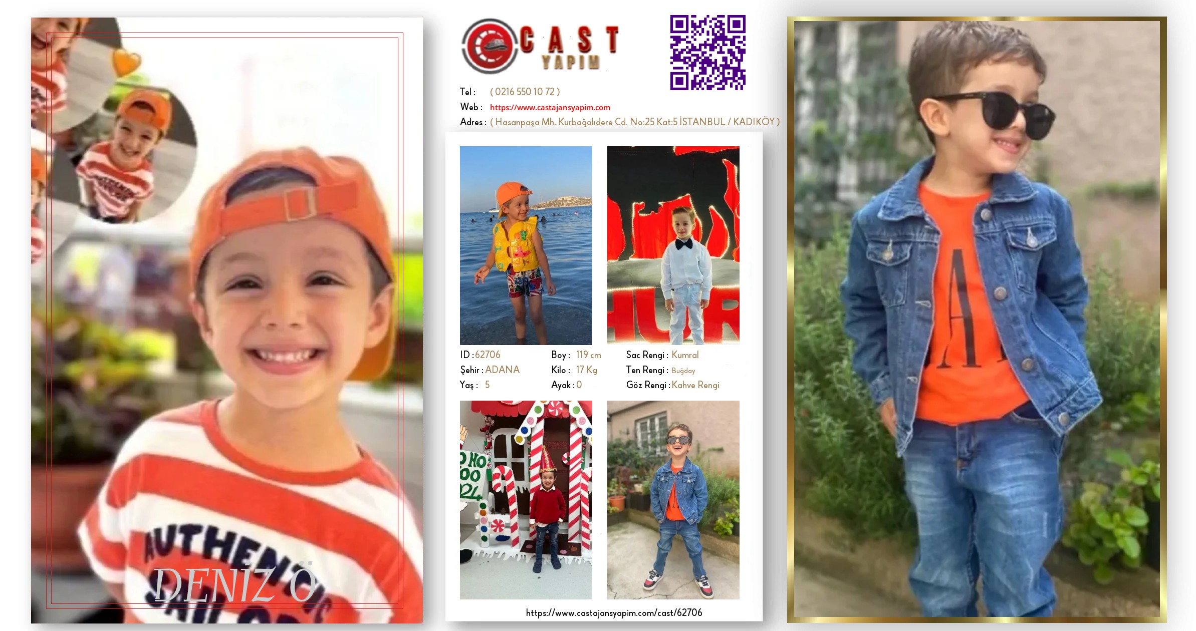 Merhaba, ben DENİZ. ADANA şehrinde yaşıyorum ve 6 yaşındayım. Genel özelliklerim arasında boyum 119 cm, kilom 17 kg, saç rengim Kumral, göz rengim Kahve Rengi, ten rengim Buğday.