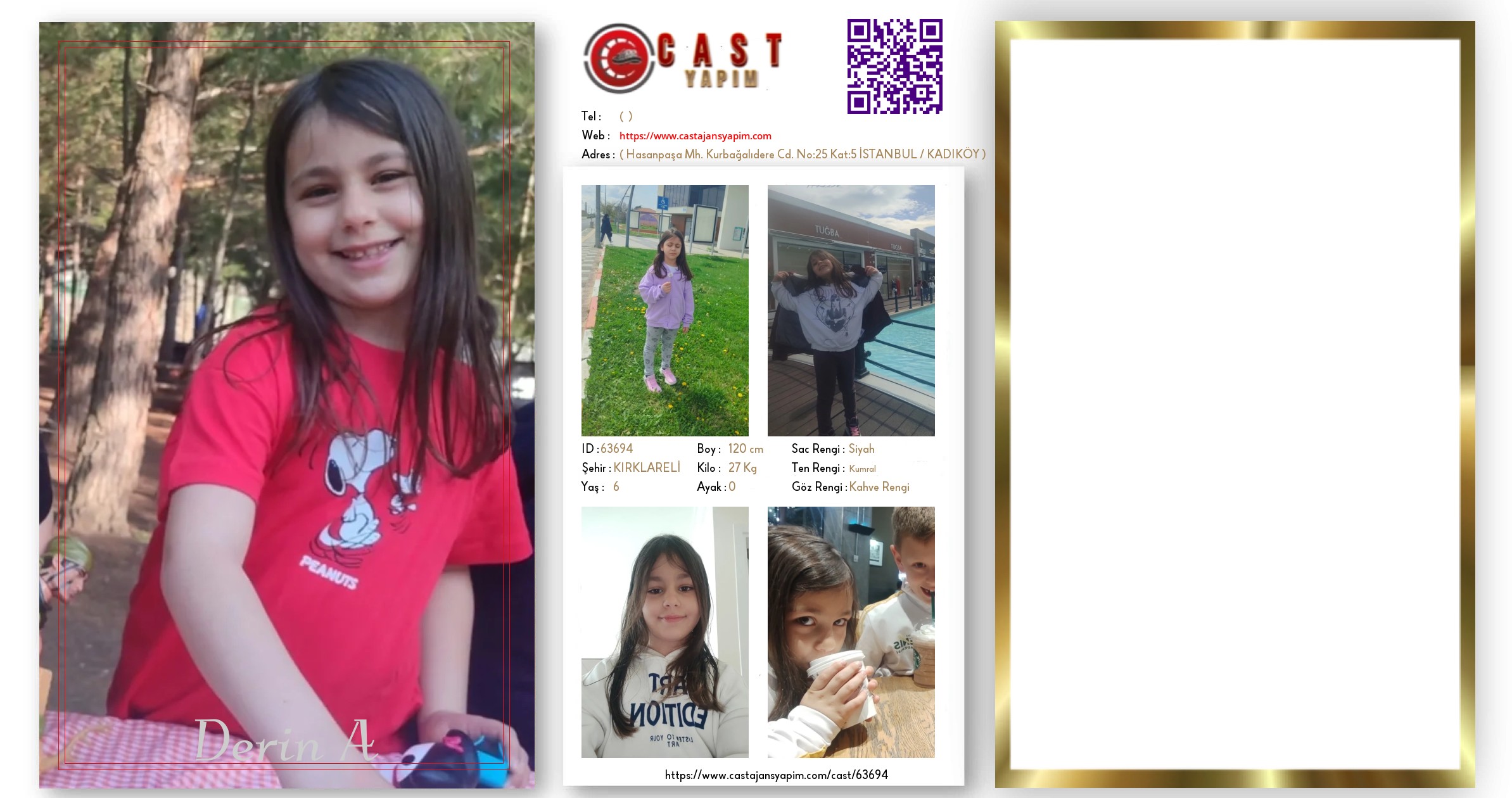 Merhaba, ben Derin A. KIRKLARELİ şehrinde yaşıyorum ve 7 yaşındayım. Genel özelliklerim arasında boyum 120 cm, kilom 27 kg, saç rengim Siyah, göz rengim Kahve Rengi, ten rengim Kumral.