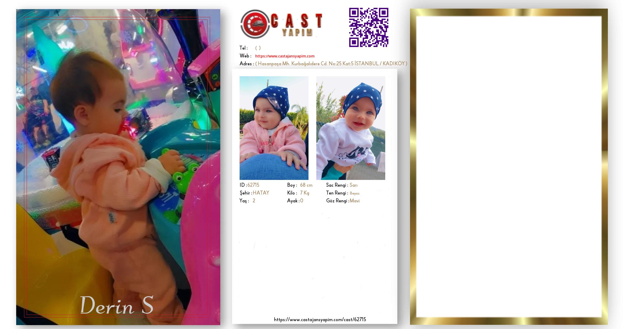 Merhaba, ben Derin S. HATAY şehrinde yaşıyorum ve 2 yaşındayım. Genel özelliklerim arasında boyum 68 cm, kilom 7 kg, saç rengim Sarı, göz rengim Mavi, ten rengim Beyaz.