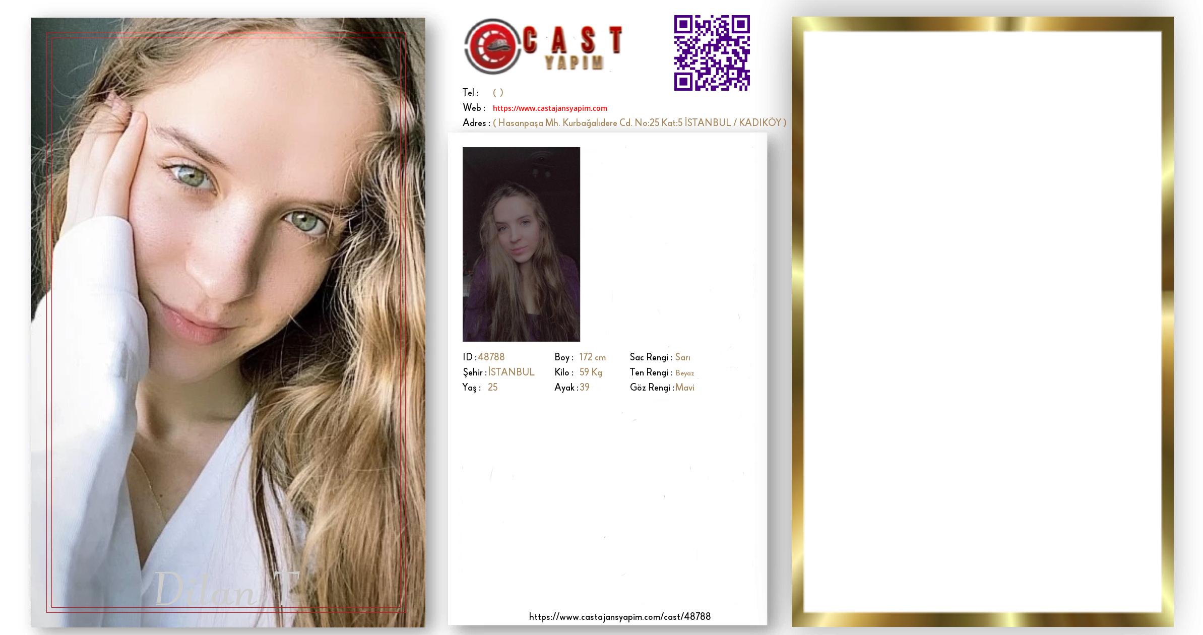 Merhaba, ben Dilan T. İSTANBUL şehrinde yaşıyorum ve 25 yaşındayım. Genel özelliklerim arasında boyum 172 cm, kilom 59 kg, saç rengim Sarı, göz rengim Mavi, ten rengim Beyaz.