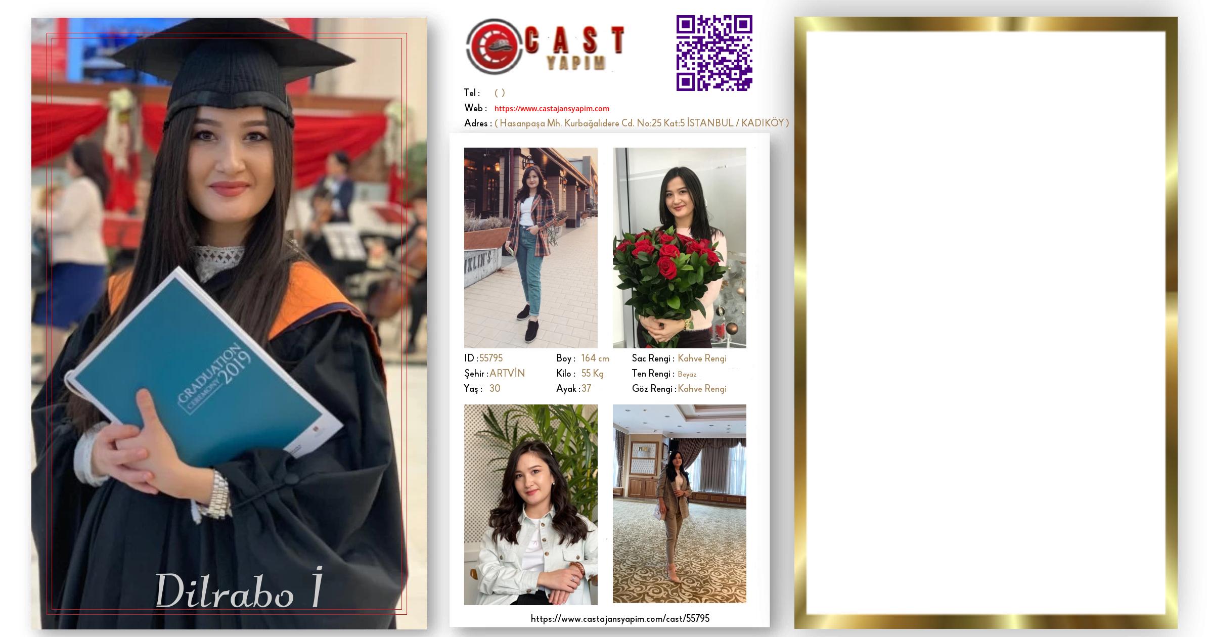 Merhaba, ben Dilrabo. ARTVİN şehrinde yaşıyorum ve 30 yaşındayım. Genel özelliklerim arasında boyum 164 cm, kilom 55 kg, saç rengim Kahve Rengi, göz rengim Kahve Rengi, ten rengim Beyaz.