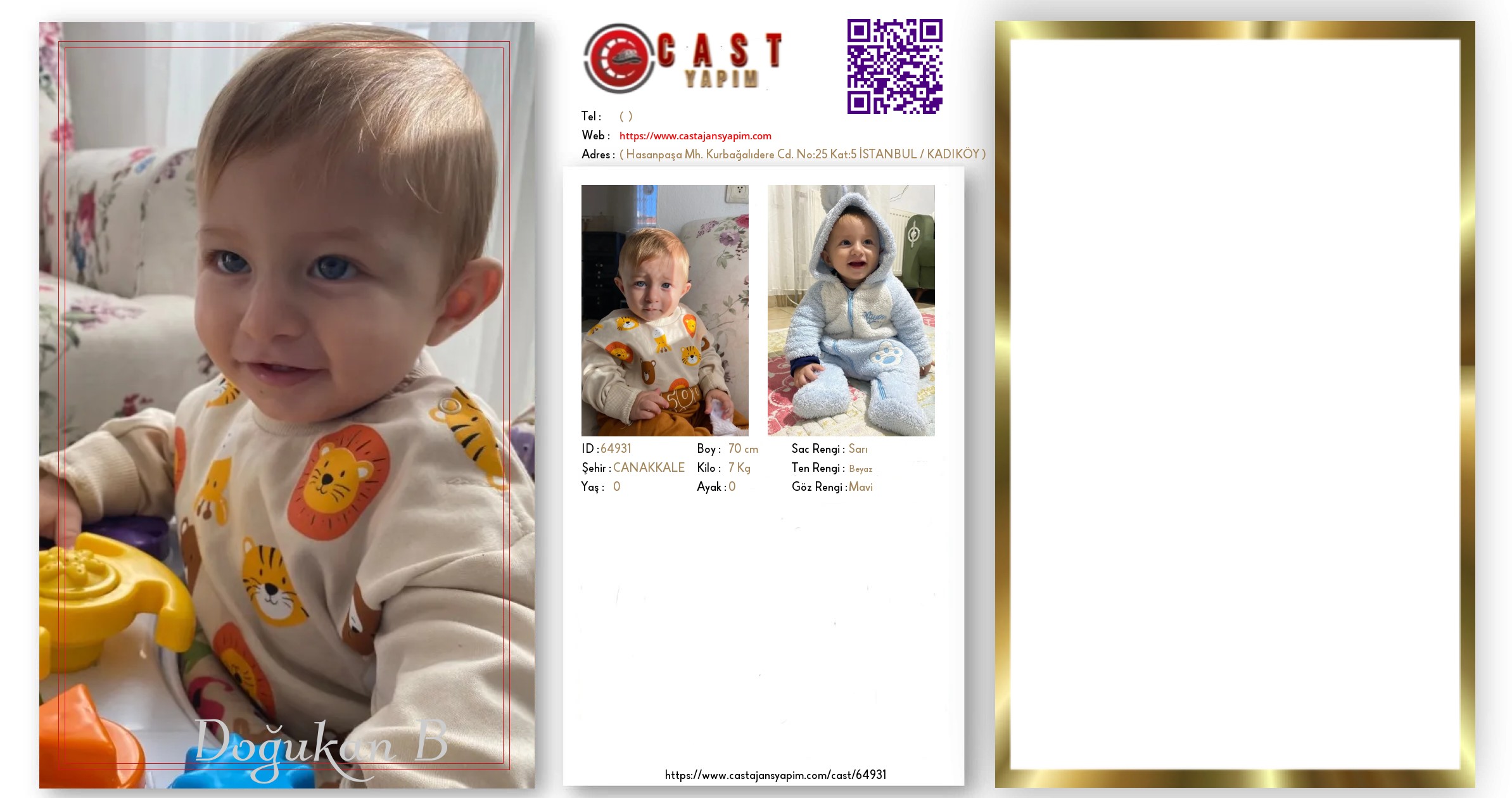 Merhaba, ben Doğukan B. ÇANAKKALE şehrinde yaşıyorum ve 1 yaşındayım. Genel özelliklerim arasında boyum 70 cm, kilom 8 kg, saç rengim Sarı, göz rengim Mavi, ten rengim Beyaz.