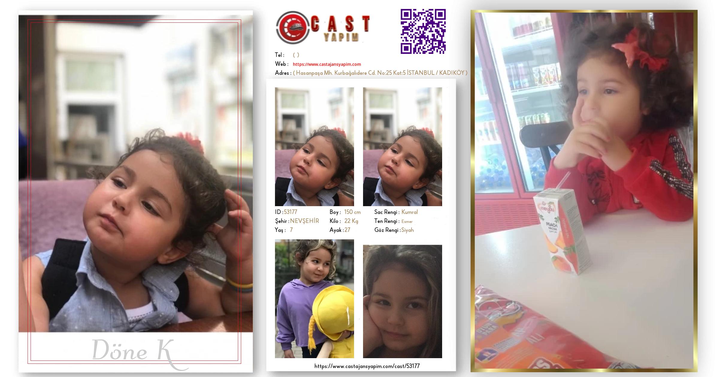 Merhaba, ben Döne K. NEVŞEHİR şehrinde yaşıyorum ve 7 yaşındayım. Genel özelliklerim arasında boyum 150 cm, kilom 22 kg, saç rengim Kumral, göz rengim Siyah, ten rengim Esmer.