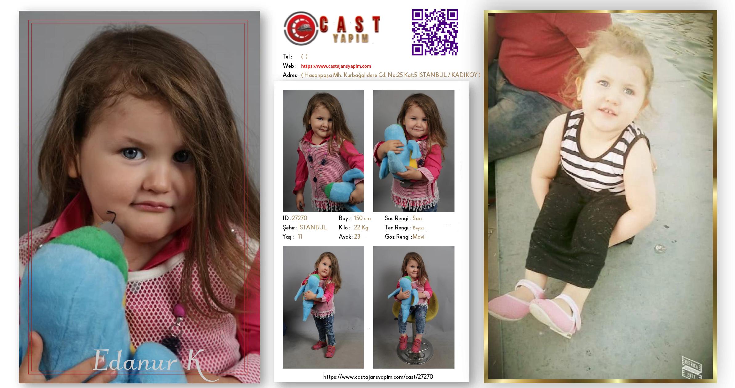 Merhaba, ben Edanur. İSTANBUL şehrinde yaşıyorum ve 11 yaşındayım. Genel özelliklerim arasında boyum 150 cm, kilom 22 kg, saç rengim Sarı, göz rengim Mavi, ten rengim Beyaz.