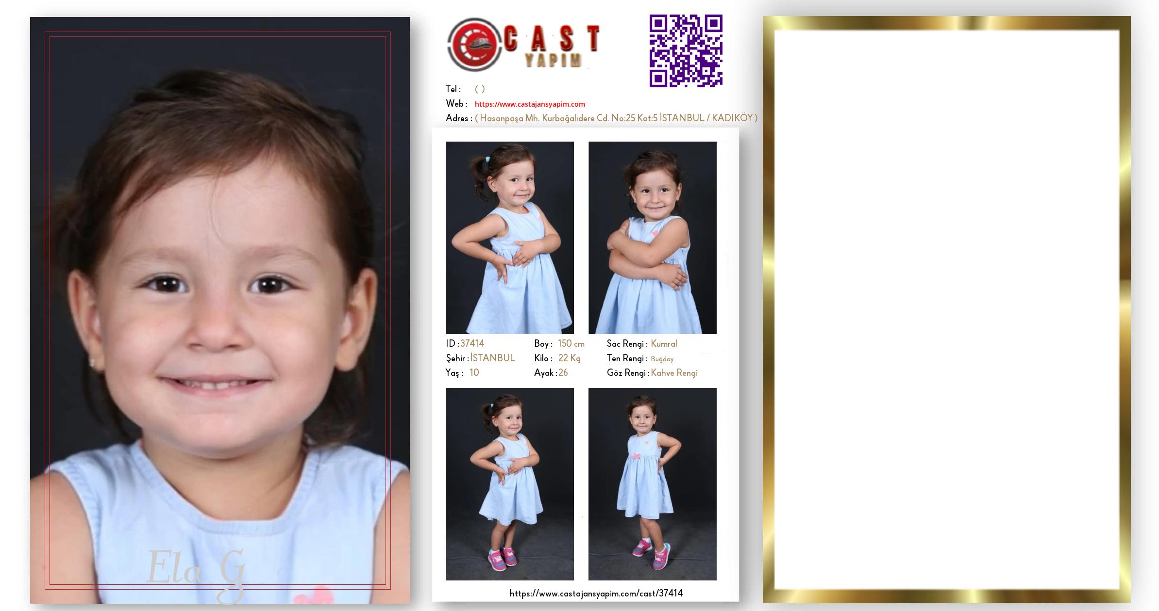 Merhaba, ben Ela. İSTANBUL şehrinde yaşıyorum ve 10 yaşındayım. Genel özelliklerim arasında boyum 150 cm, kilom 22 kg, saç rengim Kumral, göz rengim Kahve Rengi, ten rengim Buğday.