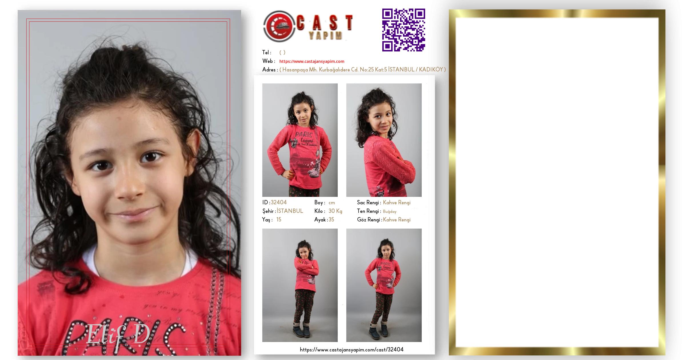 Merhaba, ben Elif D. İSTANBUL şehrinde yaşıyorum ve 15 yaşındayım. Genel özelliklerim arasında kilom 30 kg, saç rengim Kahve Rengi, göz rengim Kahve Rengi, ten rengim Buğday.