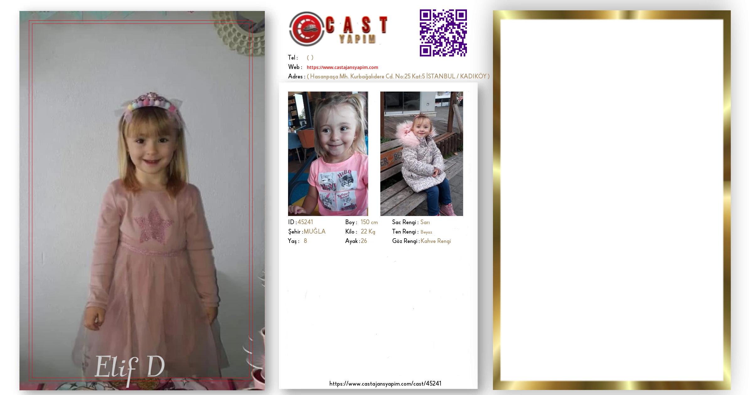 Merhaba, ben Elif D. MUĞLA şehrinde yaşıyorum ve 8 yaşındayım. Genel özelliklerim arasında boyum 150 cm, kilom 22 kg, saç rengim Sarı, göz rengim Kahve Rengi, ten rengim Beyaz.