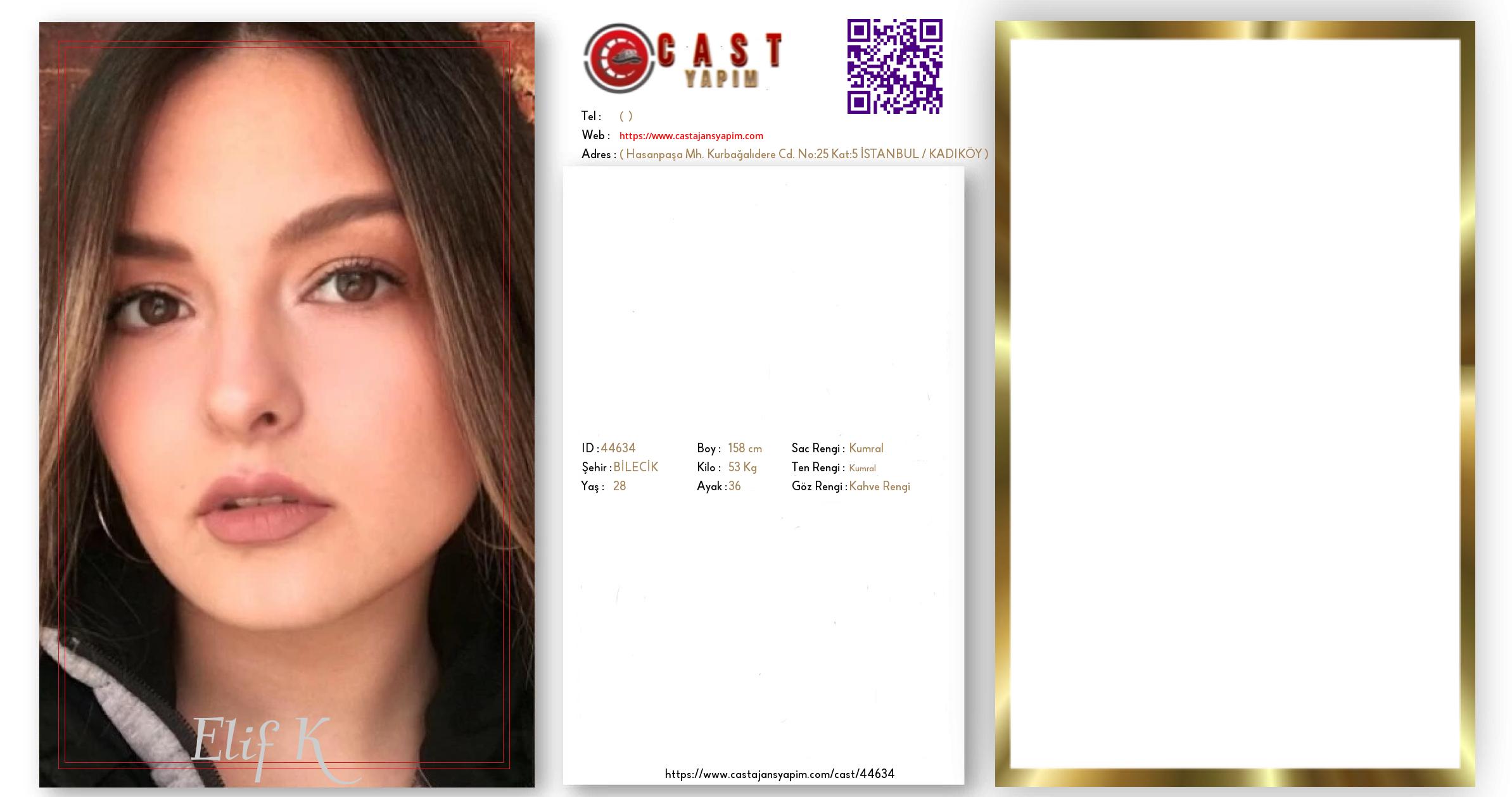 Merhaba, ben Elif. BİLECİK şehrinde yaşıyorum ve 28 yaşındayım. Genel özelliklerim arasında boyum 158 cm, kilom 53 kg, saç rengim Kumral, göz rengim Kahve Rengi, ten rengim Kumral.