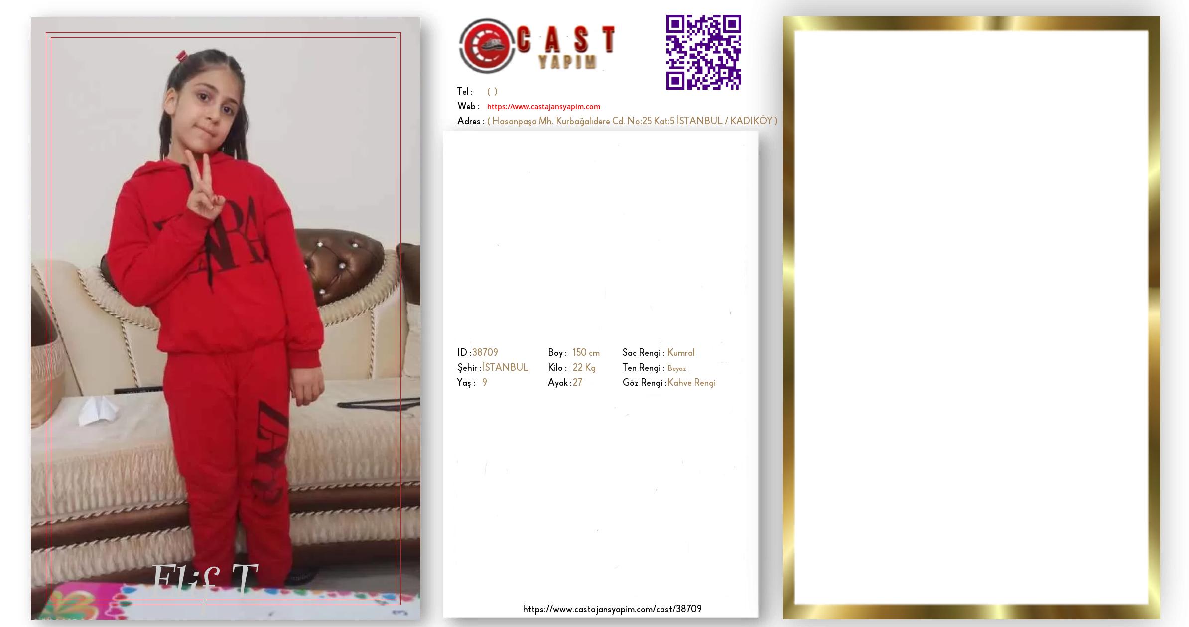 Merhaba, ben Elif T. İSTANBUL şehrinde yaşıyorum ve 9 yaşındayım. Genel özelliklerim arasında boyum 150 cm, kilom 22 kg, saç rengim Kumral, göz rengim Kahve Rengi, ten rengim Beyaz.