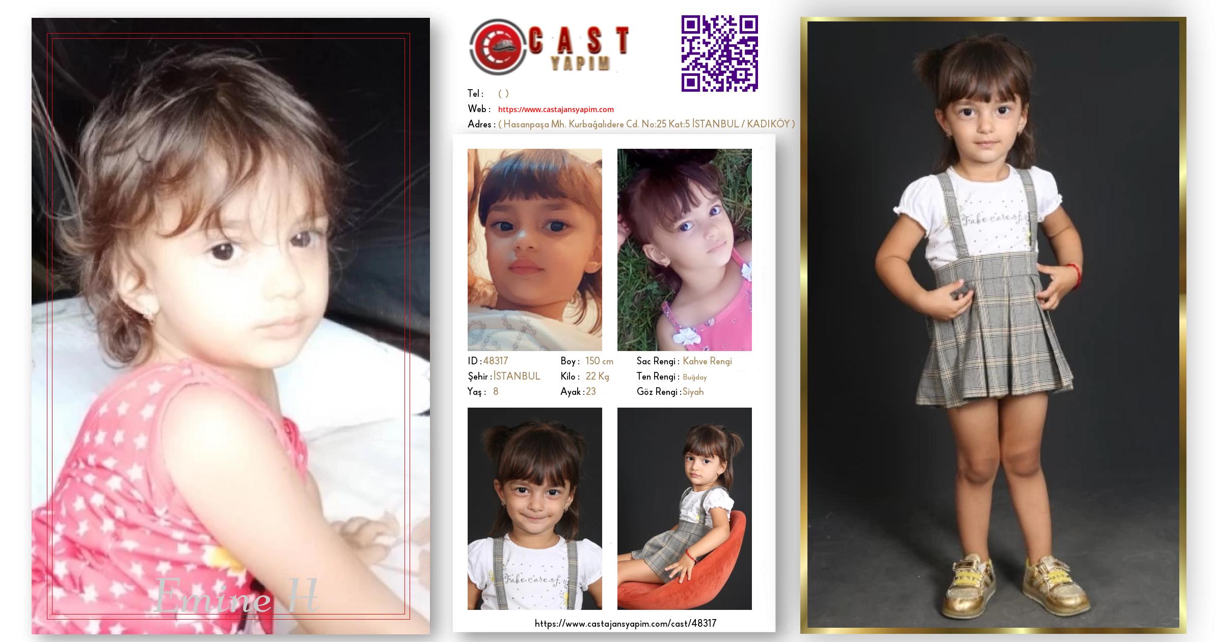 Merhaba, ben Emine. İSTANBUL şehrinde yaşıyorum ve 8 yaşındayım. Genel özelliklerim arasında boyum 150 cm, kilom 22 kg, saç rengim Kahve Rengi, göz rengim Siyah, ten rengim Buğday.
